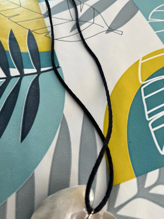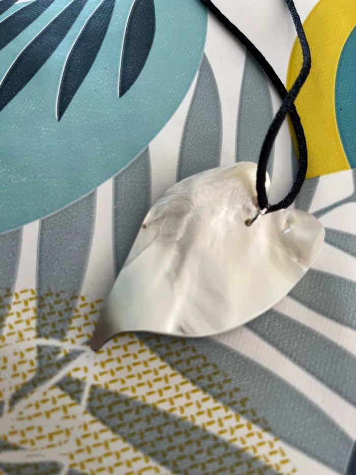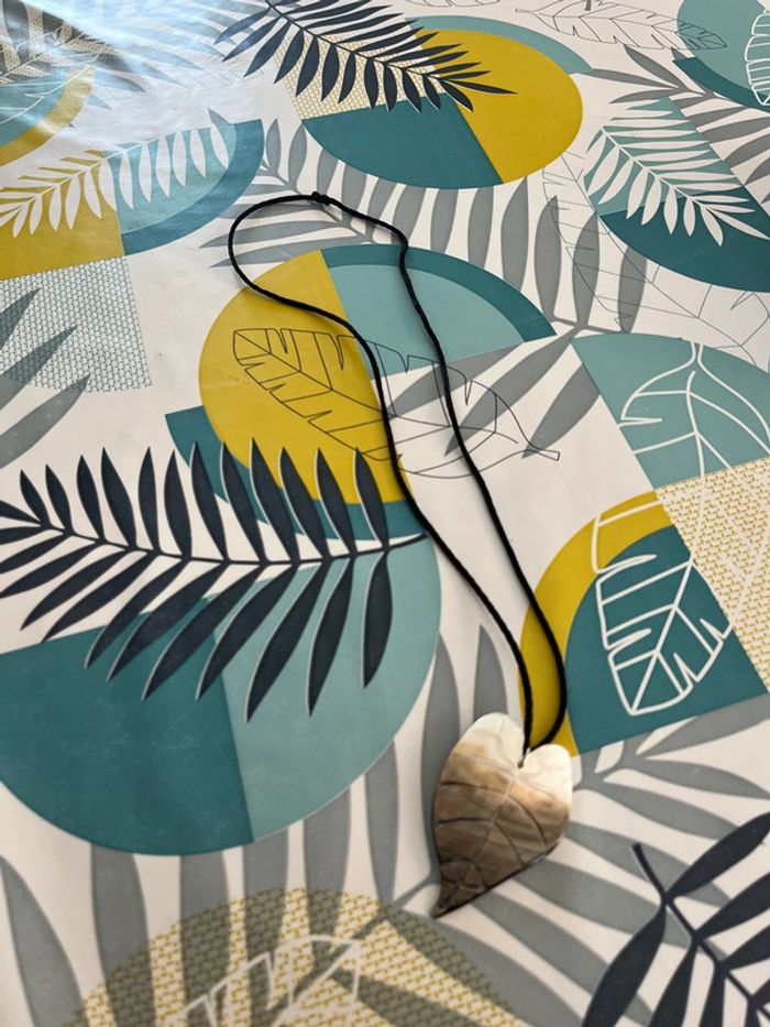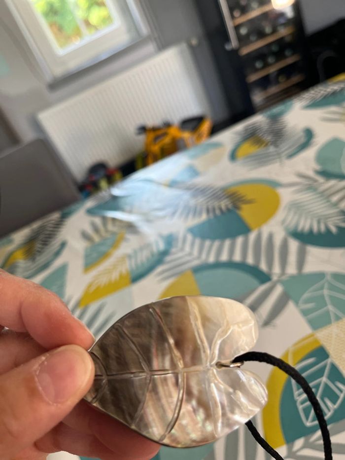 Collier avec pendentif feuille je ne peut certifier que c’est de la nacre mais il reste en bon état