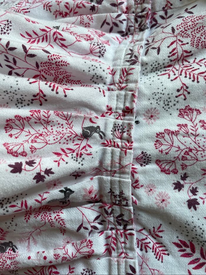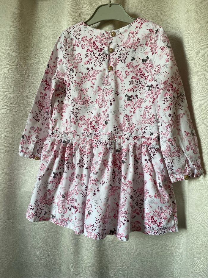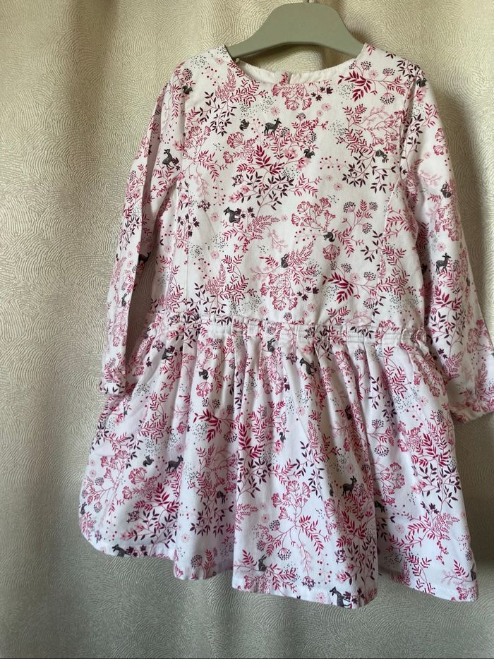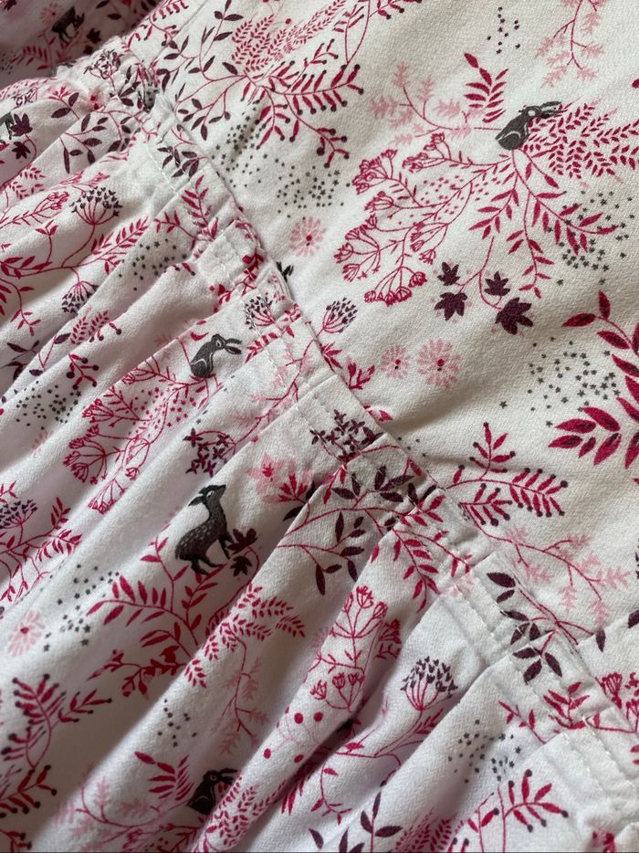 Trop jolie petite robe manches longues Fond blanc thème forêt biche écureuil lapin tons fuschia et gris Entièrement doublée 100% coton Taille 4 ans 104 cm Sergent Major