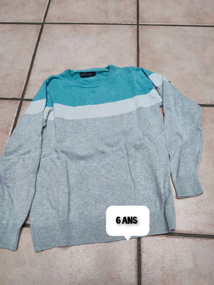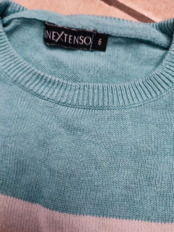 Vends pull de la marque in extenso, de couleurs bleu turquoise, blanc et gris rayé. Taille 6 ans. Ok pour un 5 ans selon la taille de l'enfant 110/116cm