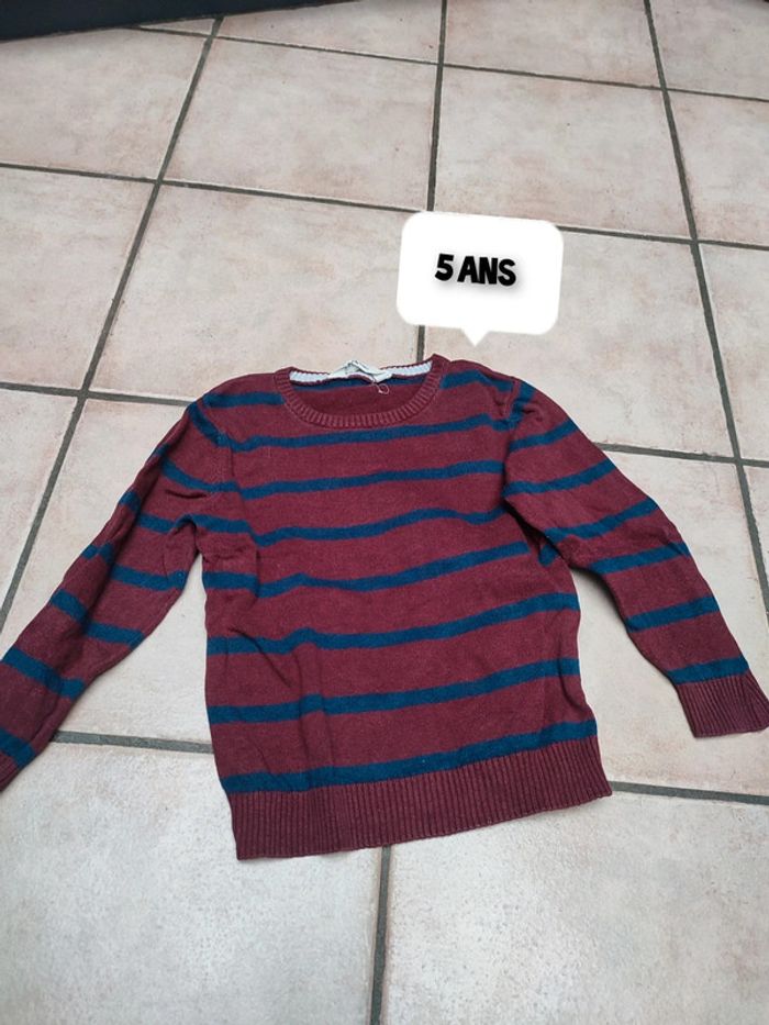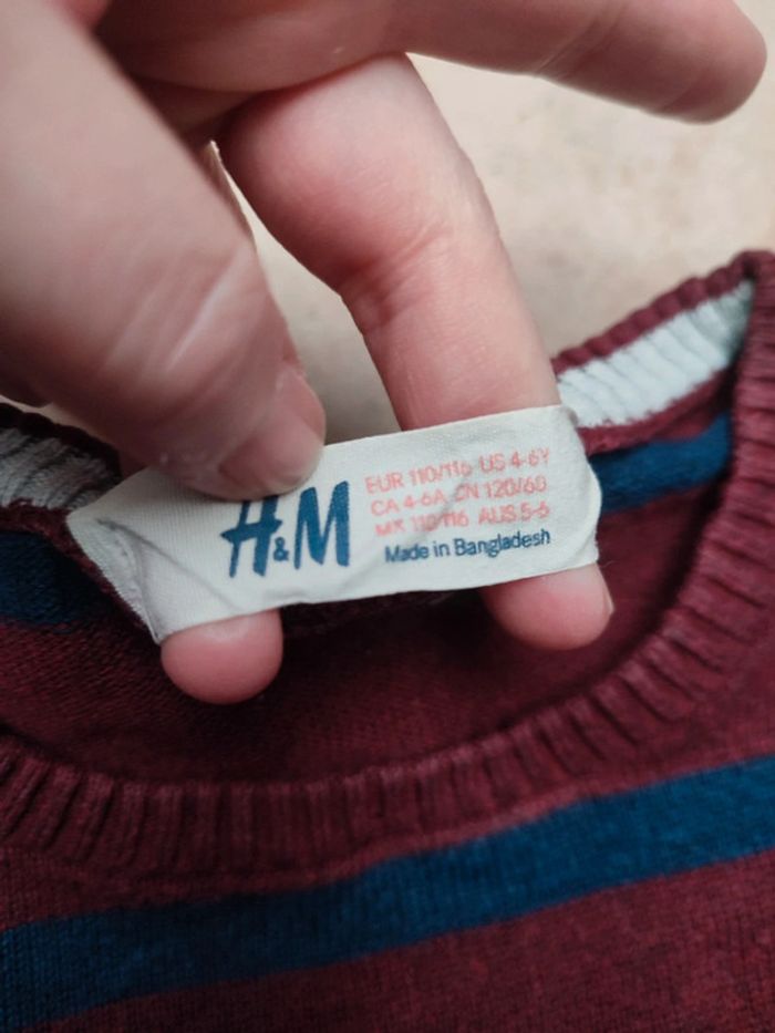 Vends pull de marque H&M, taille 110/116cm. Rayé bordeaux et bleu marine. En très bon état.
