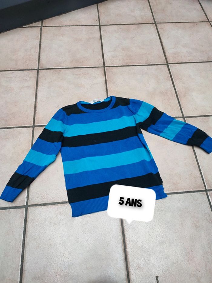Vends pull de marque H&M, taille 110/116cm. Rayé de couleur noir et différents bleus. En très bon état.