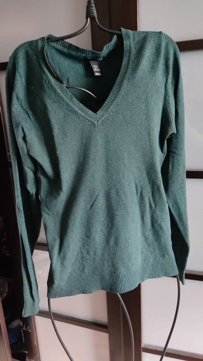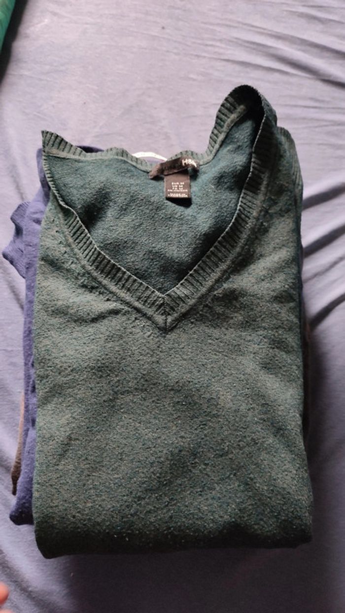 Vends pull marque H&M. Taille 38. Couleur vert canard. Un peu pelucheux. Matière moulante et près du corps