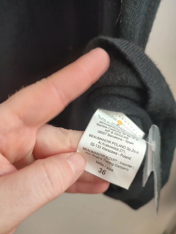 Vends robe pull de la marque Cache cache. Couleur noire. Col bénitier détails poche au niveau de la poitrine. Taille 36