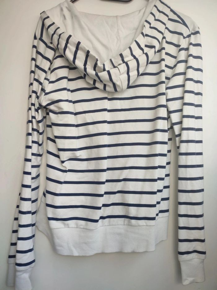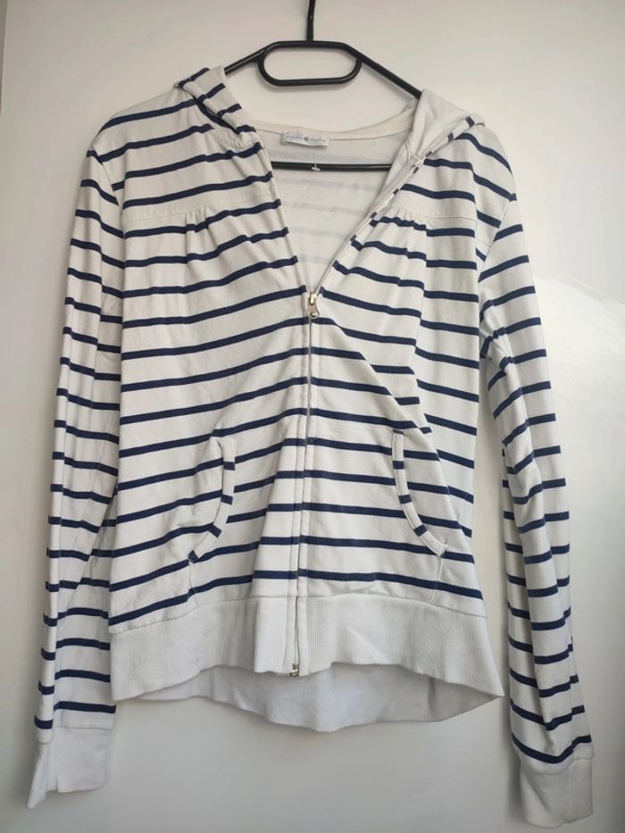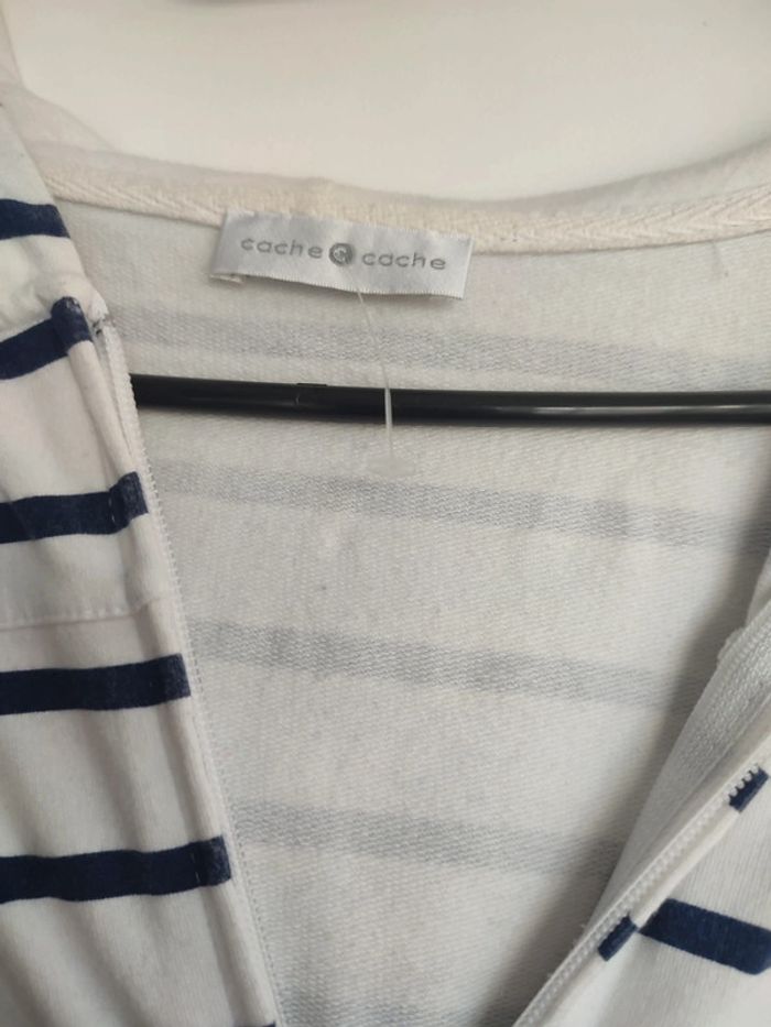 Vends gilet cache cache. Rayé blanc bleu. Tâche sur le revers de la capuche. Taille 36/38