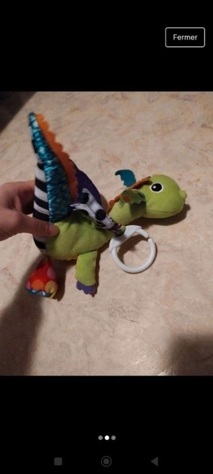 Vends dragon de la marque lamaze avec différentes textures et couleurs. Tirette pour le faire voler (les ailes battent sur qqs cm).