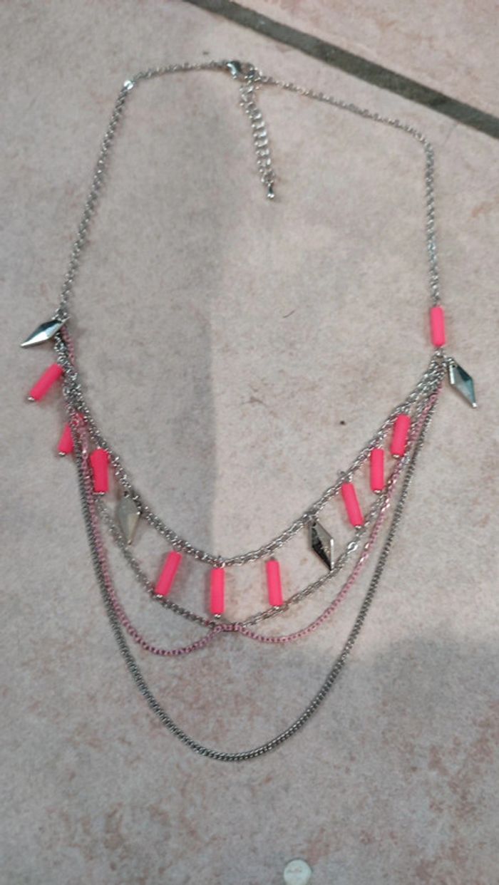 Vends collier fantaisie avec plusieurs rangées. Couleur Argent et rose. Plaqué.