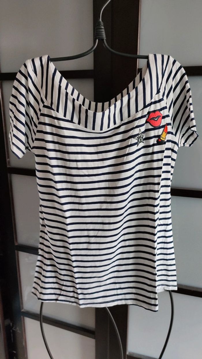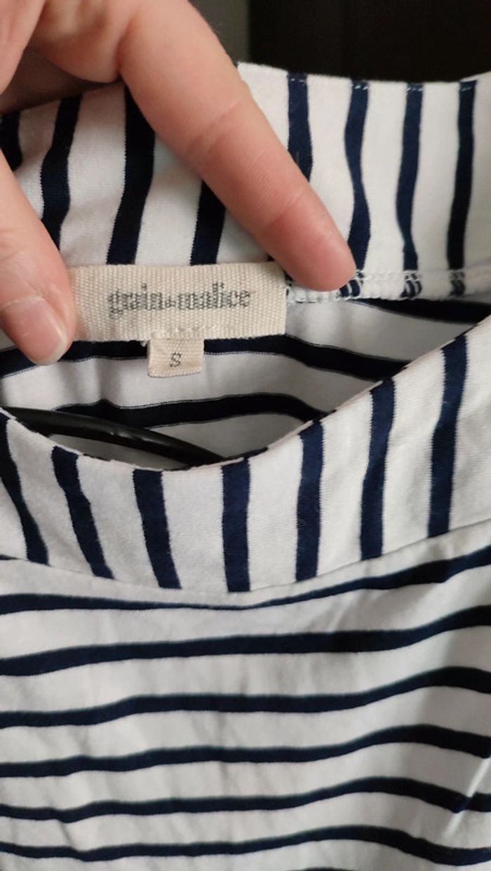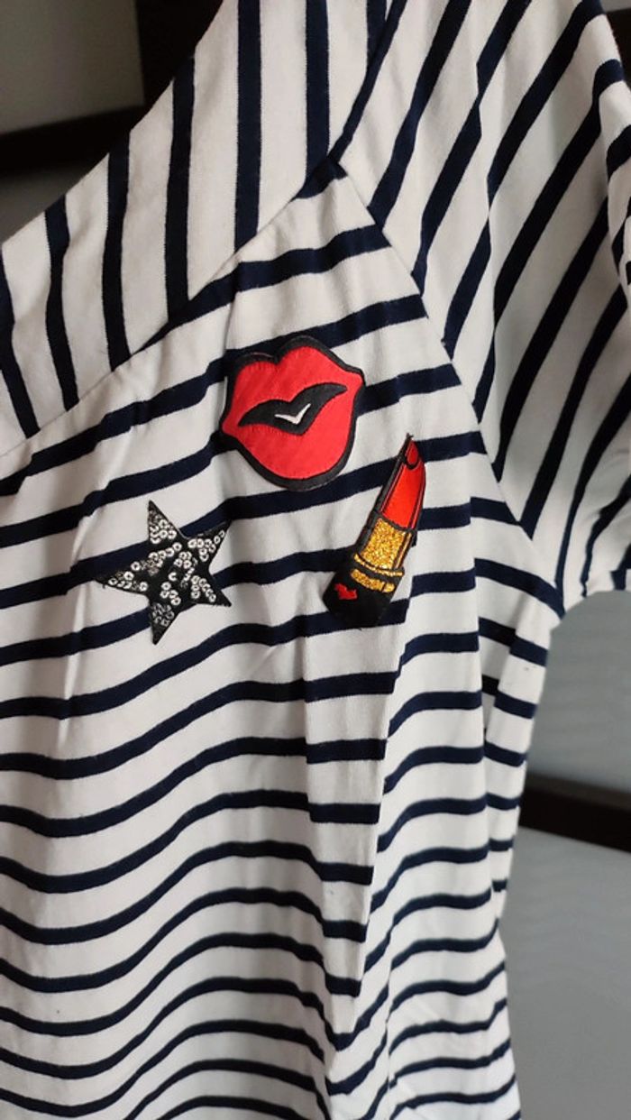 Vends t-shirt grain de malice. Taille S. Motif girly rock. Rayé noir et blanc. Très bon état