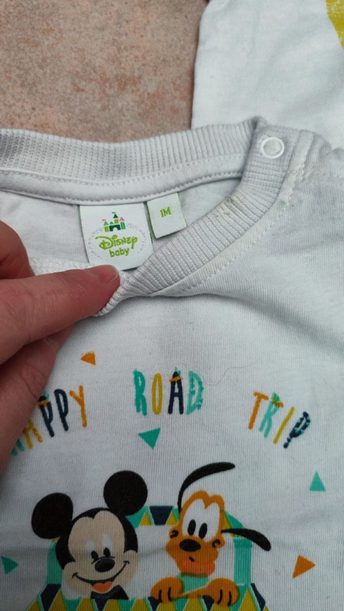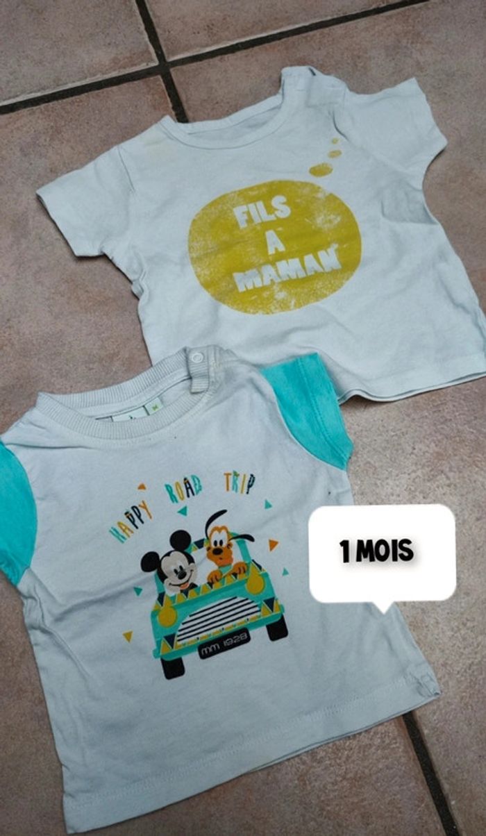 Vends lot de t-shirt. Taille 1 mois Motif Mickey et fils a maman. Petite tâche. Cf photo. Pour visualiser tout le 1 mois cliquez #1moislesfringuesdejulie