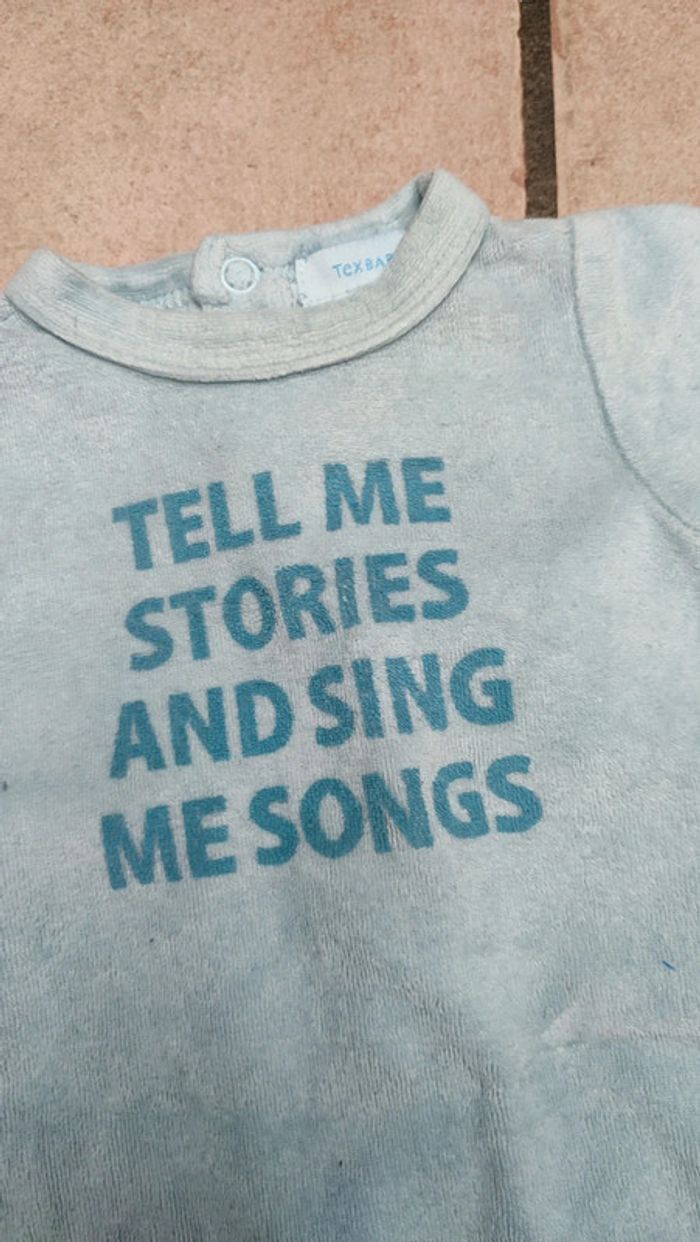 Vends pyjama de marque Tex baby. Motif "Telle me stories and sont me sont. Bon état. Étiqueté taille 0 mais Taille 1 mois ok. Pour visualiser tout le 1 mois cliquez #1moislesfringuesdejulie