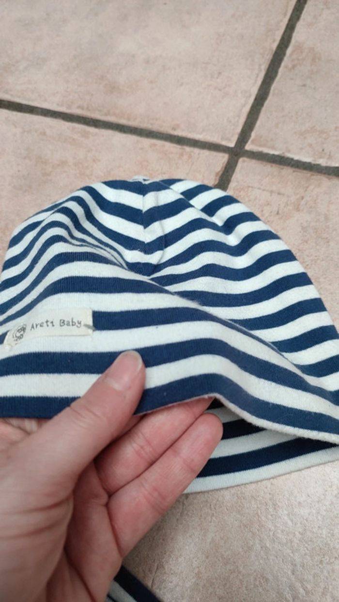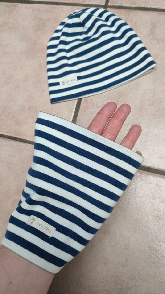 Vends ensemble bonnet et écharpe snood. Mi saison. Idéal pour le printemps. Couleur blanc et bleu rayé. Taille extensible a partir de 6mois/2ans. Pour visualiser tout le 6mois cliquez #6moislesfringuesdejulie