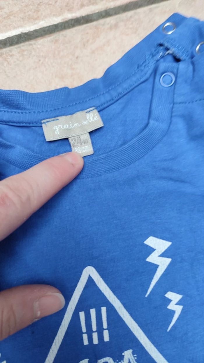 Vends t-shirt bleu motif caractère fort marque Grain de blé. Taille 24 mois. #24moislesfringuesdejulie