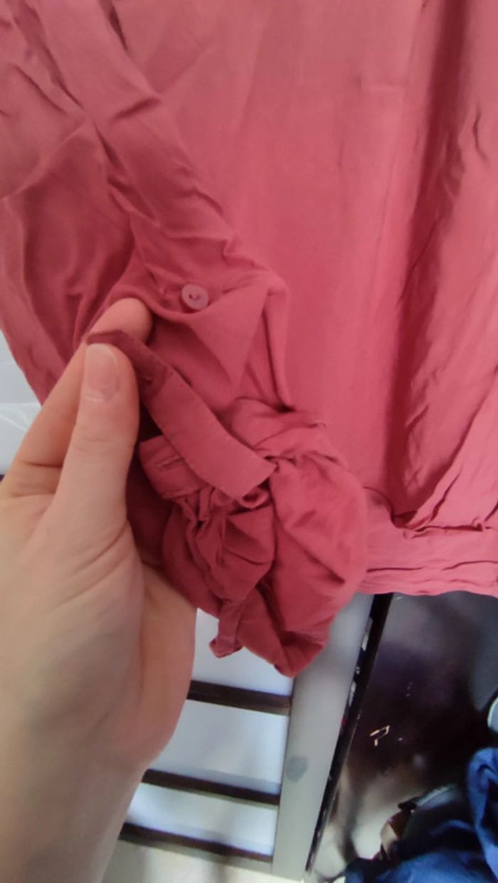 Vends blouse rose clair ou vieux rose. Manches longues qui peuvent se retrousser. Marque camaïeu. Très bon état (mérite du repassage).