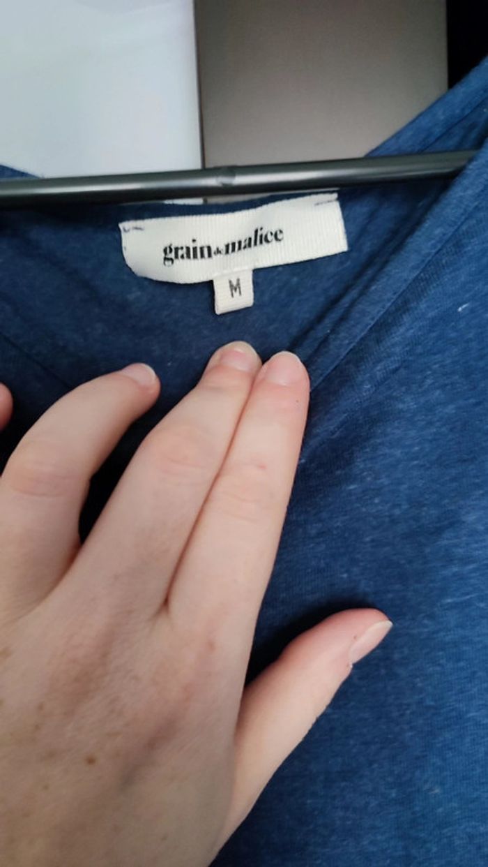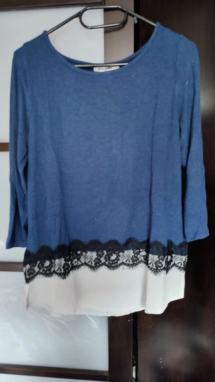 Vends t-shirt manches longues marque grain de malice. Couleur blanc, bleu séparé par de la dentelle noir. Taille 38. Très bon état