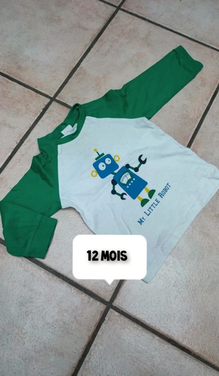 Vends t-shirt manches longues avec motif robot. Taille 12 mois. Tâches légère sur le haut du T-shirt. Cf photo. Pour visualiser tout le 12 mois cliquez sur #12moislesfringuesdejulie