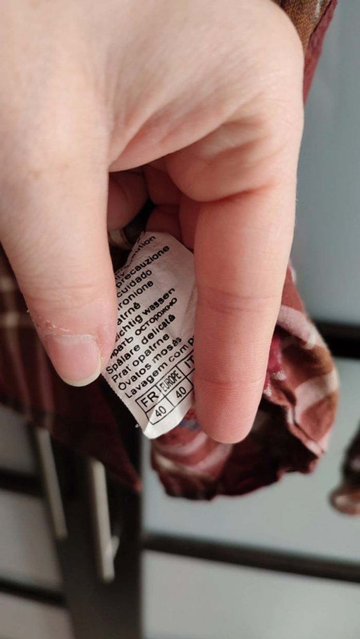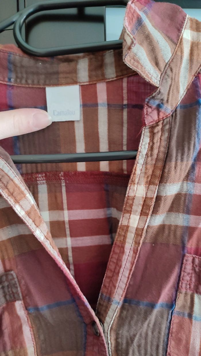 Vends chemise a ligne, effet carreaux, couleurs bordeaux marrons. Étiquette taille 40 mais plutôt un 38. Marque Camaïeu.