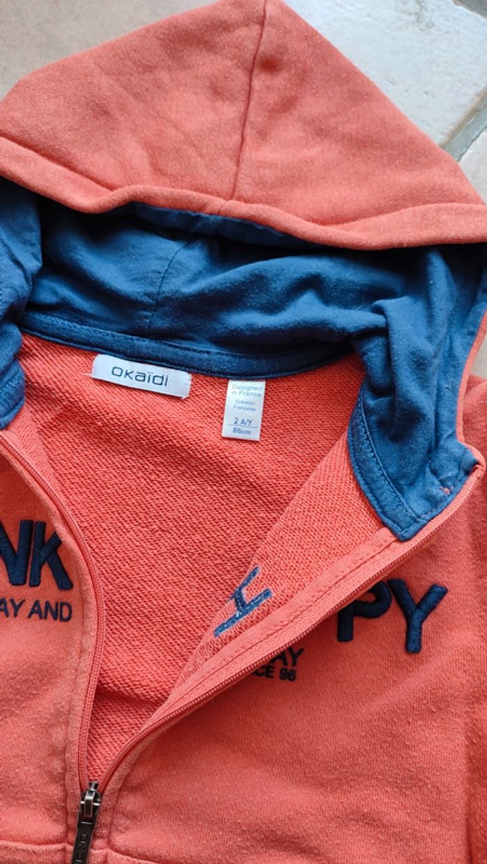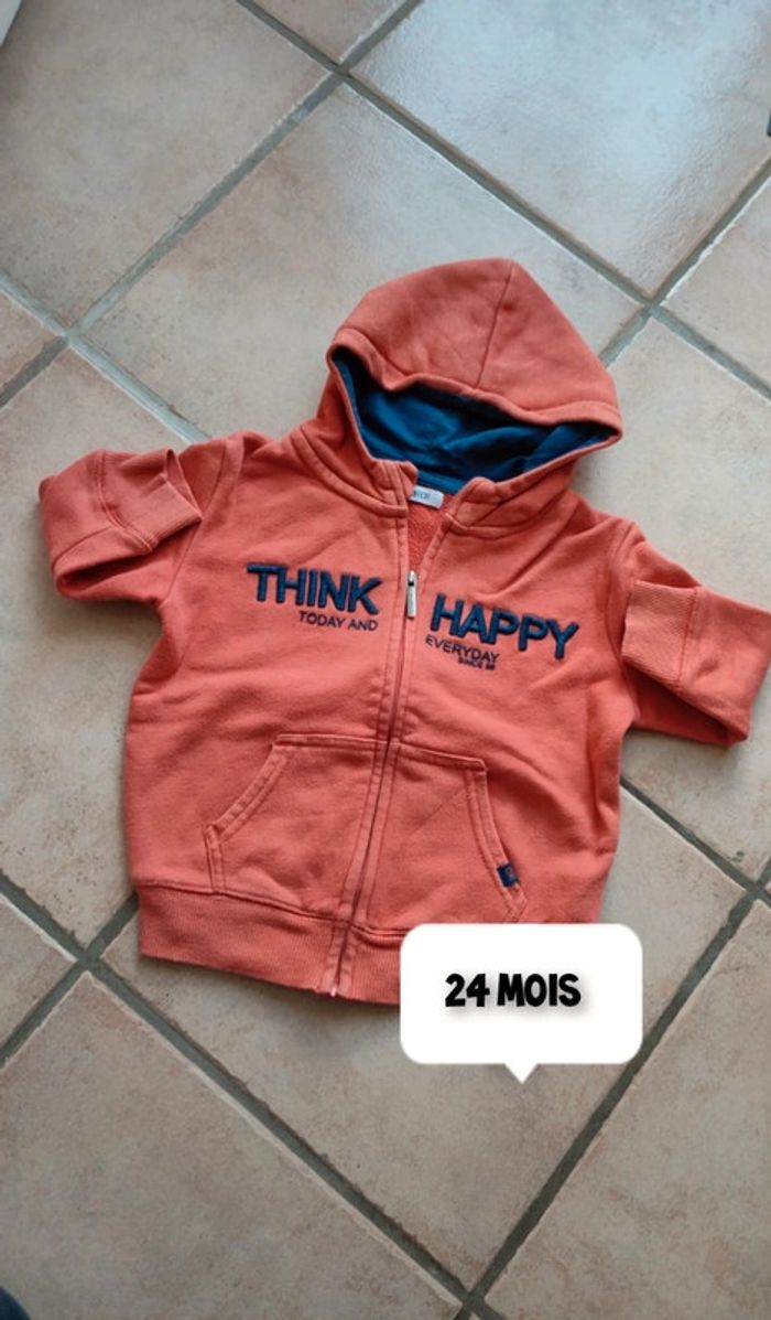 Vends sweat à capuche, couleur saumon et bleu, thinck happy. Marque Okaïdi. Taille 24 mois. Pour visualiser tout le 24 mois cliquez #24moislesfringuesdejulie