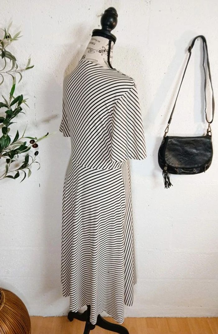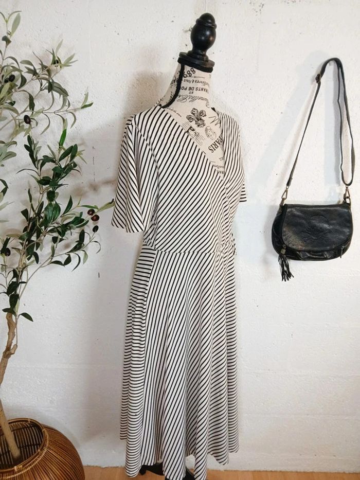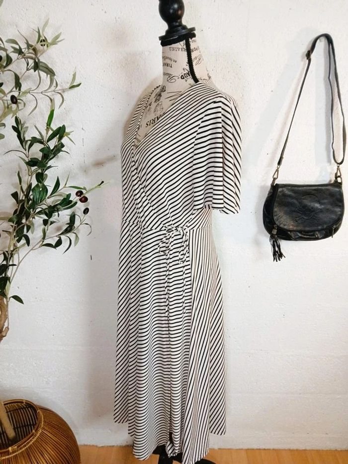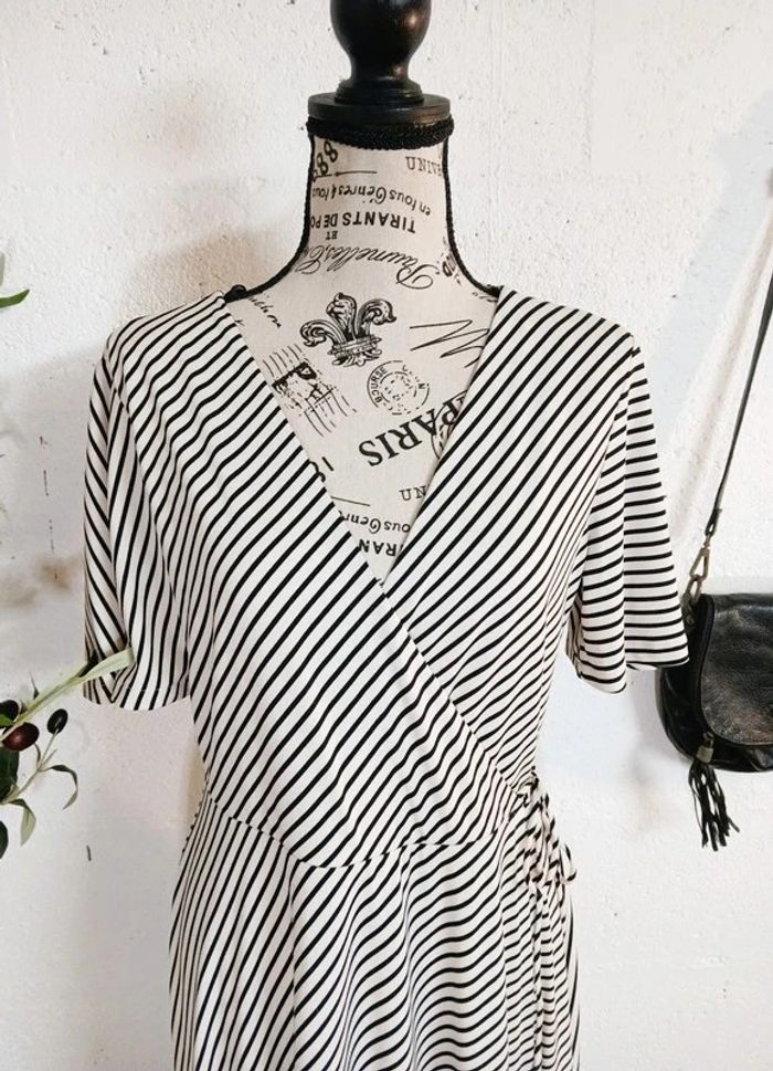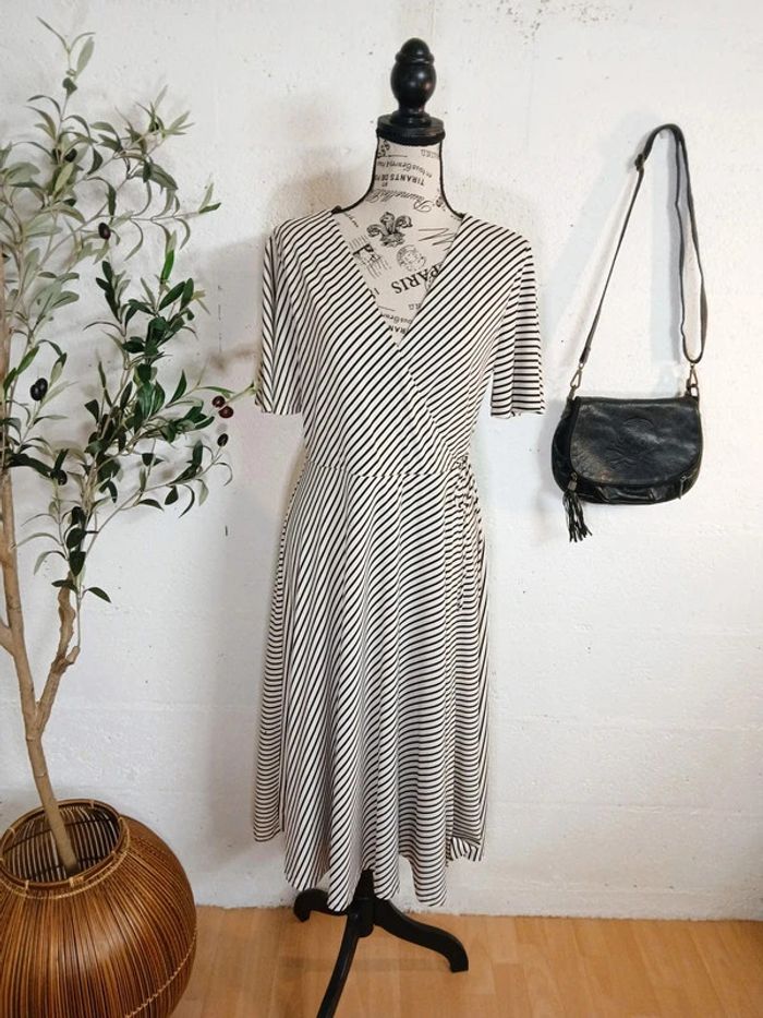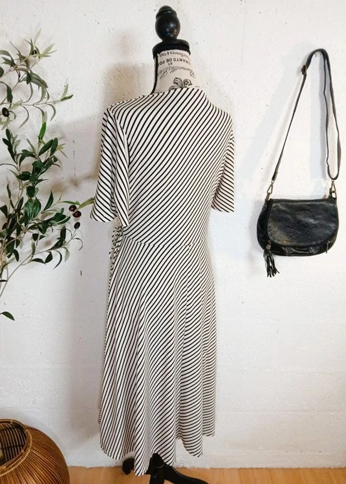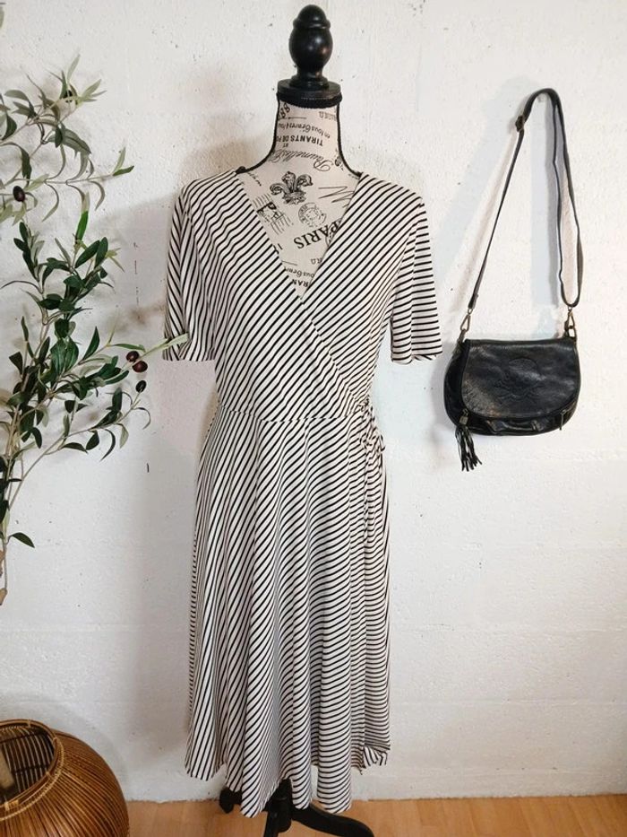 ✨ Superbe robe H&M à la coupe cache-cœur, flatteuse et idéale pour valoriser la silhouette. 💫 Motif à rayures obliques, manches courtes, et petit nœud à la taille . 👗 Coupe évasée type patineuse : fluide, élégante et féminine. 📏 Mesures à plat : – Aisselles : 46 cm – Taille : env. 40 cm – Longueur totale : 110 cm 🧵 Tissu agréable, fluide avec une belle tenue. 📌 En très bon état, portée avec soin. 📸 Le sac visible sur les photos est aussi en vente dans mon dressing (vendu séparément). Il se marie parfaitement avec cette robe ! 🛍️ Réduction appliquée dès 2 articles achetés : pensez aux lots pour économiser sur les frais de port ✨ 👗 Retrouvez dans mon dressing d’autres pièces d’été à petits prix : robes, blouses, sacs, chaussures… Faites-vous plaisir ! 🏷️ Hashtags : #RobeFéminine #RobeCacheCoeur #HM #TailleM #LookÉté #ModeFemme