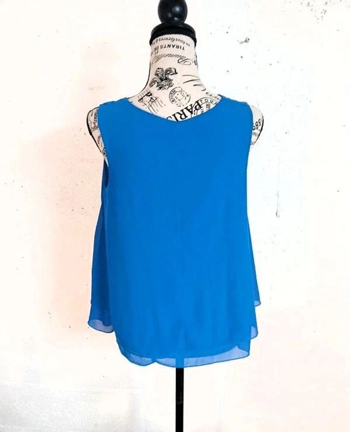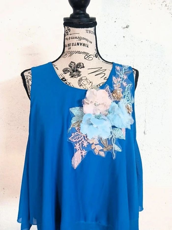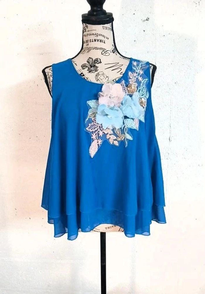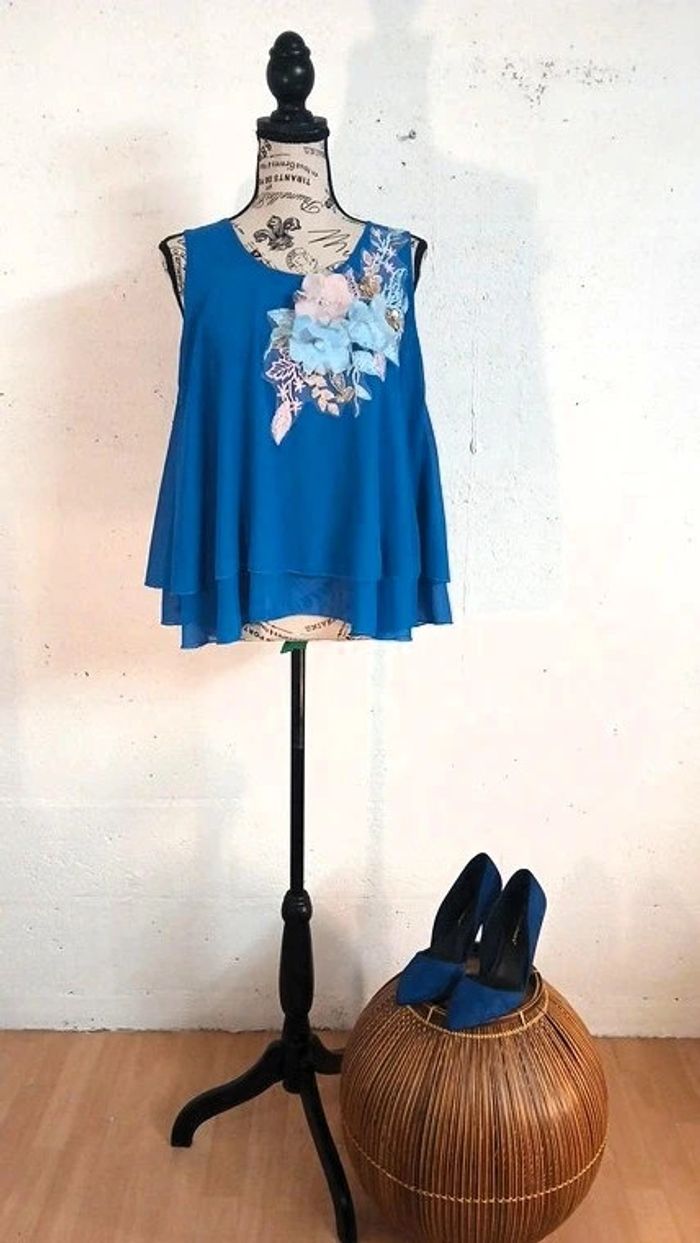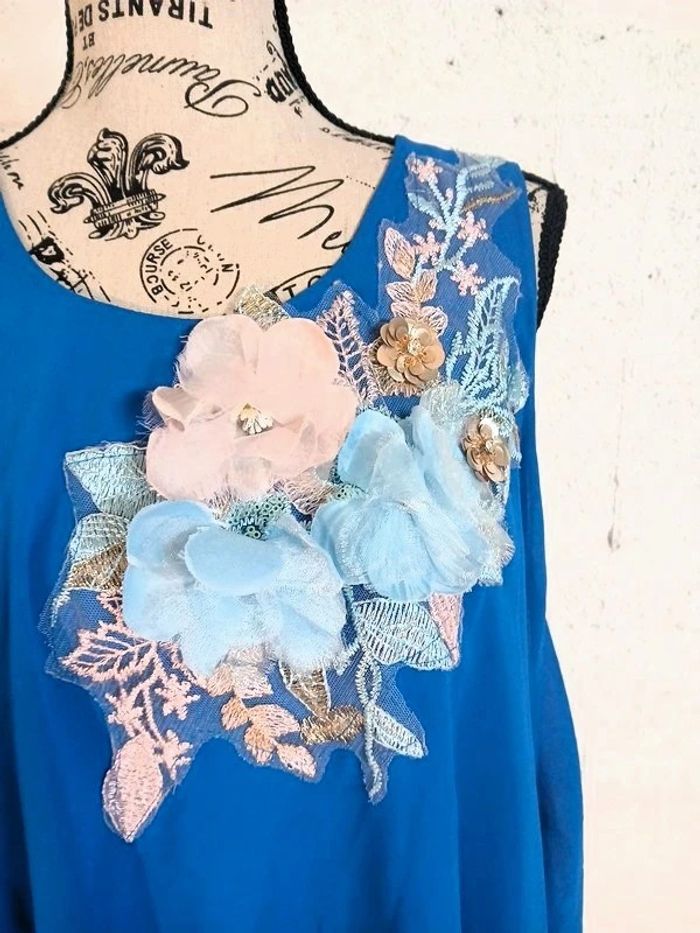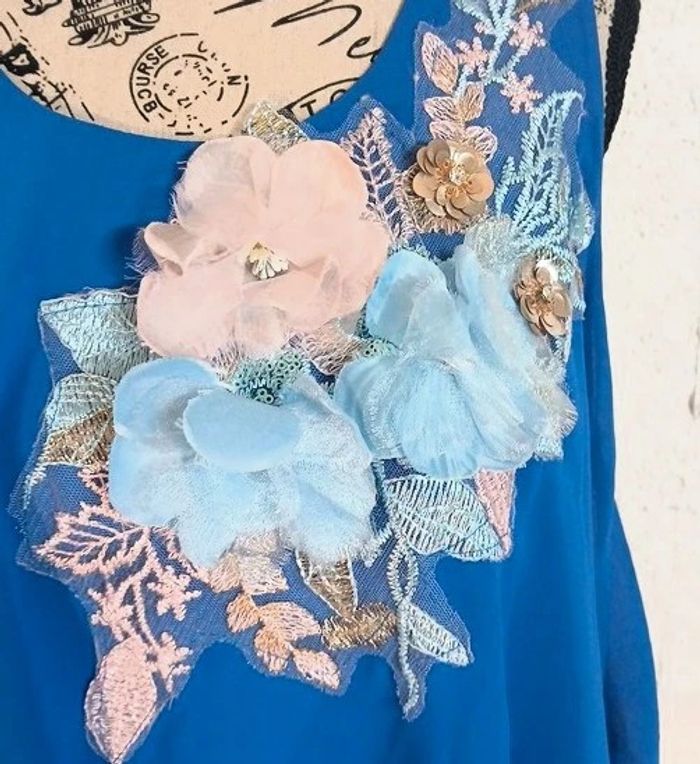Blouse originale et élégante, couleur bleu électrique, parfaite pour un look frais et féminin ! Détails brodés et fleurs en relief sur le devant pour une touche raffinée 🌸✨ ✔️ Coupe fluide et aérienne ✔️ Finition asymétrique sur le bas ✔️ Appliqué fleuri brodé avec effets de textures ✔️ Très bon état, portée très occasionnellement ✔️ Taille unique mais convient pour un 40 📏 Mesures à plat : – Largeur aisselles : 47 cm – Longueur dos : 55 cm 📌 Matière : Polyester & Viscose 👠 Escarpins visibles sur certaines photos disponibles à part dans mon dressing ! 🌈 Réductions dès 2 articles achetés – pensez au lot pour économiser sur les frais de port 😍 🔖 Hashtags #blousefemme #hautfluide #topélégant #taille40 #lookété #vintedfr