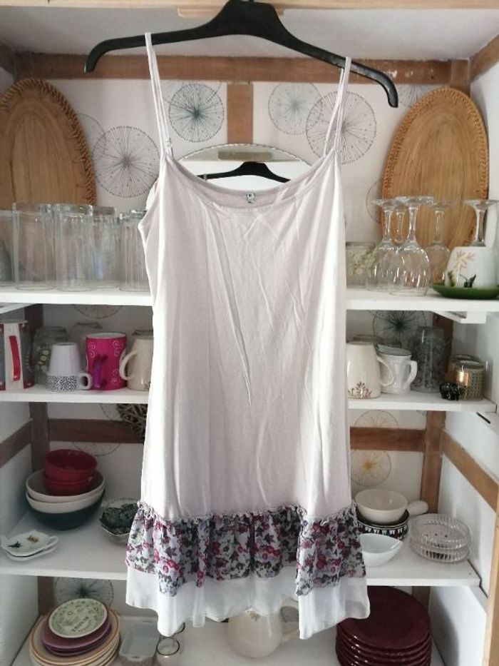 Robe courte taille 38 40 avec volant fleuri. Réglable au niveau des bretelles