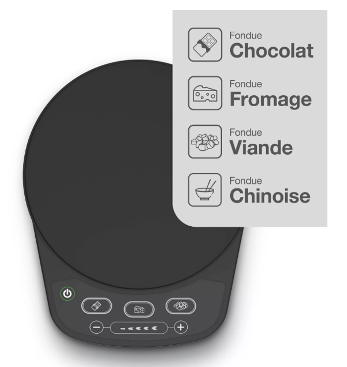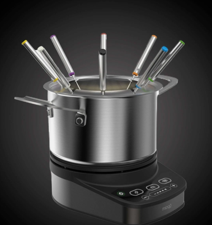 Multi Fondue Electrique MIOGO Cuve inox avec 6 fourchettes + pochette, notices incluses Les points clés Fondue chocolat Fondue fromage Fondue viande Fondue Chinoise Nombre de personnes : 6 1.200 W Thermostat réglable multi positions Le + : Programmes automatiques pour réussir toutes les fondues selon vos envies Comprenant: La plaque électrique 1200W Socle Inox Cuve Inox lavable lave vaisselle 6 Fourchettes inox Sac rangement fourchettes inox Notices d'utilisation Livre de recettes