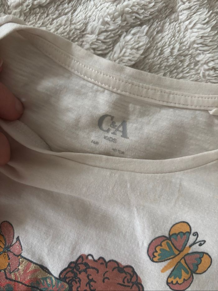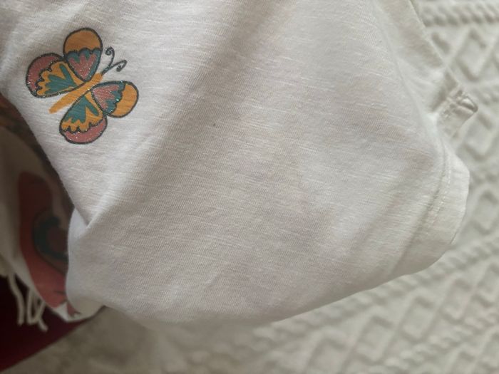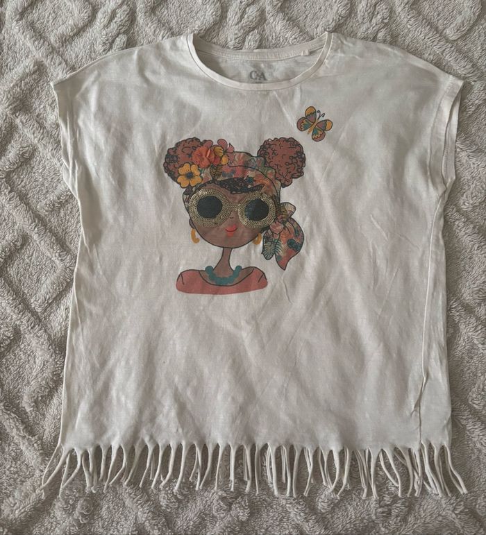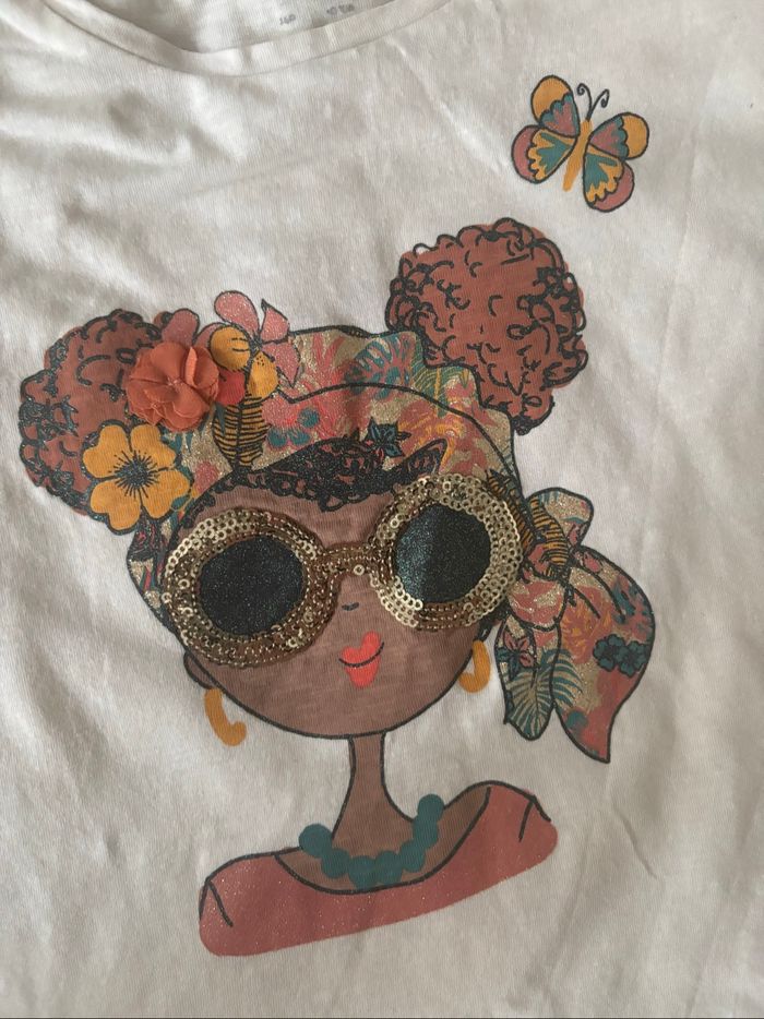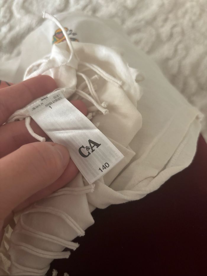 • 140 cm soit 10 ans. Acheté chez C&A. Une petite tache. Paillettes, sequins et fleur en relief. 100% coton.