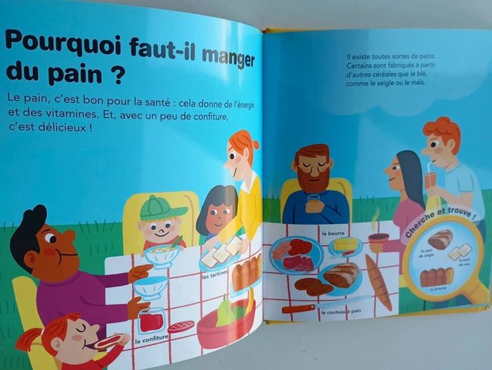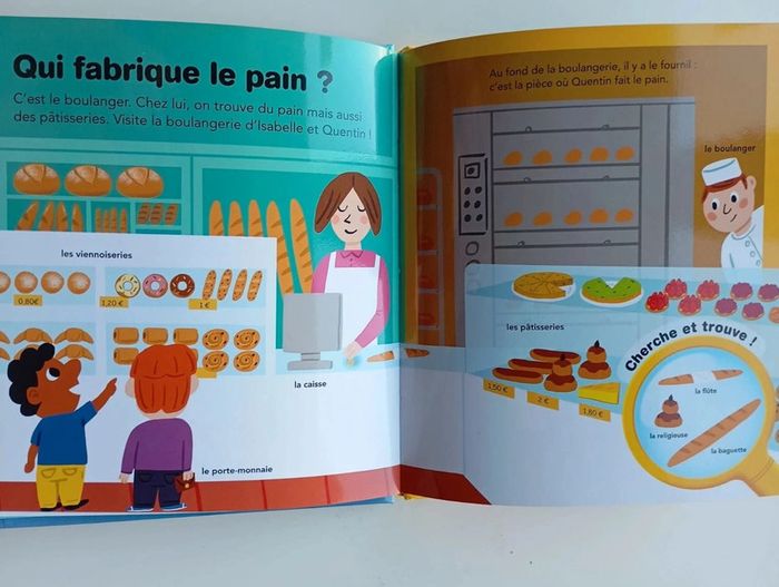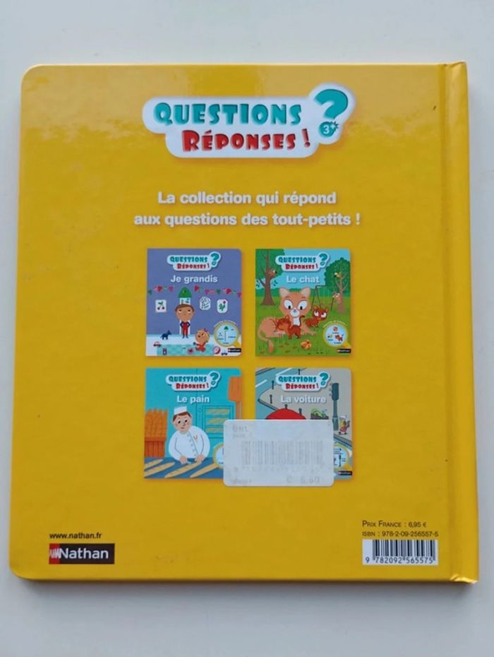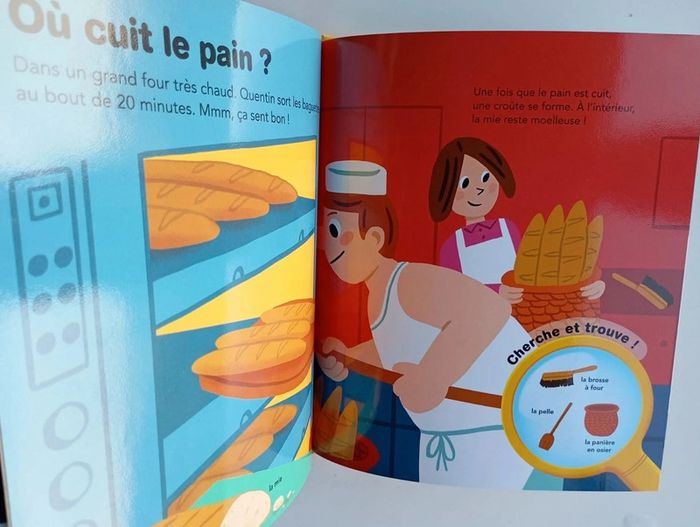 Les principales questions des petits pour découvrir le travail du boulanger ! Qui fabrique le pain ? Avec quoi fait-on du pain ? D'où vient la farine ? Comment fait-on une baguette ? Où cuit le pain ? Comment fait-on les croissants ? Pourquoi faut-il manger du pain ?... Sur chaque double page, 3 objets à chercher et à la fin, une grande image à observer pour jouer à "cherche et trouve" Éditeur ‏ : ‎ Nathan Relié ‏ : ‎ 24 pages Âge de lecture ‏ : ‎ 3 - 6 ans Dimensions ‏ : ‎ 17.9 x 0.8 x 20.2 cm Livre en parfait état Je vends d'autres questions réponses #phil_peg_questionsréponses ou cherche et trouve #phil_peg_chercheettrouve #pain #llvredocumentaire #boulanger