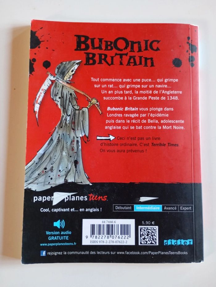 Paper Planes Teens : des histoires cools, captivantes... et en anglais ! Vous ne pourrez plus vous arrêter... .=> Ceci n’est pas un livre d’histoire ordinaire. C’est Terrible Times. On vous aura prévenus ! Résumé : Tout commence avec une puce… qui grimpe sur un rat… qui grimpe sur un navire... Un an plus tard, la moitié de l’Angleterre succombe à la Grande Peste de 1348. Bubonic Britain vous plonge dans Londres ravagée par l’épidémie puis dans le récit de Bella, adolescente anglaise qui se bat contre la Mort Noire. Niveau : Intermédiaire - à partir du A2 (4e, 3e). Éditeur ‏ : ‎ DIDIER 64 pages Âge de lecture ‏ : ‎ Dès 11 ans Dimensions ‏ : ‎ 13.8 x 0.4 x 19 cm Livre en très bon état Je vends d'autres livres en anglais #phil_peg_anglais