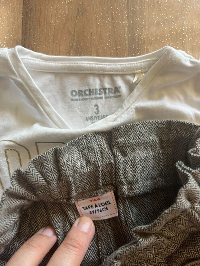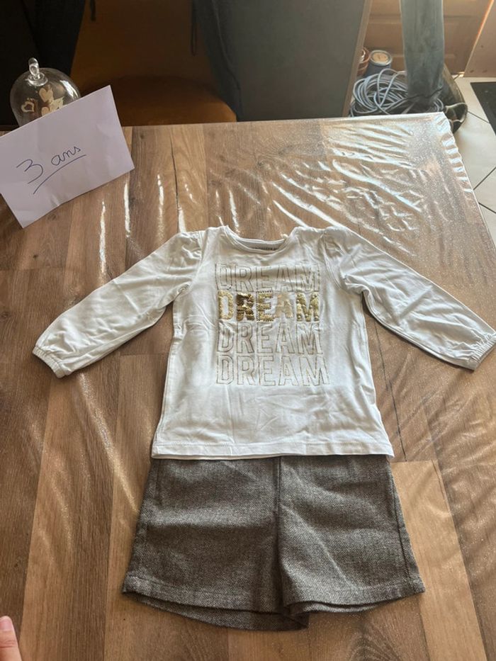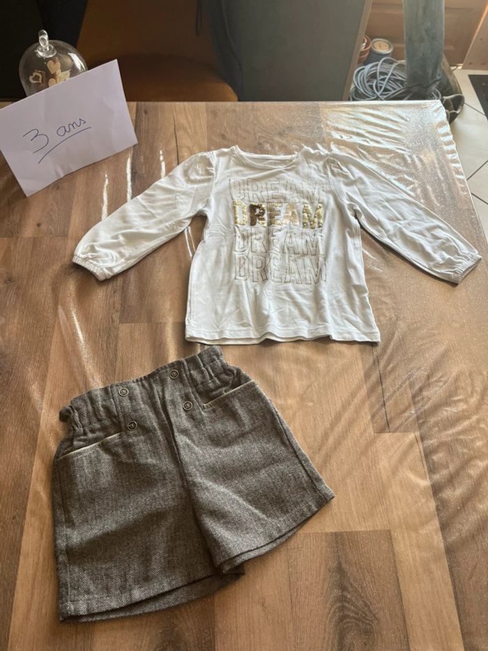 #juliie_62_3ans Ensemble composé : - d’un short - marque tape à l’œil - d’un maillot manches longues avec sequins - marque orchestra Tape 3 ans En très bon état