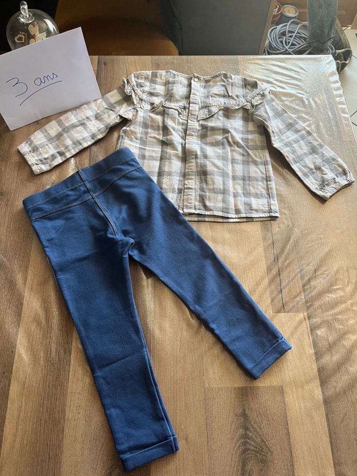 #juliie_62_3ans Ensemble composé : - d’un jegging effet jean : marque kiabi - d’une blouse avec ouverture complète dans le dos : marque Ikks Taille 3 ans En très bon état (cf dernière photo : une légère tache sur la blouse)