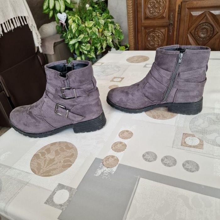 bottines pour femme couleur grise en daim fourrées à l'intérieur fantaisies sur le côté marque : IDENTITY YOURFASHIONABLE pointure 39 en bon état talon environ 3 cm