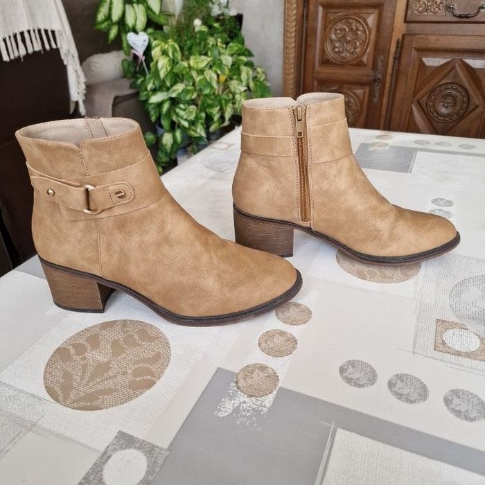 bottines pour femme couleur beige fantaisies sur le côté marque KIABI pointure 39 talon environ 5.5 cm /6 cm en bon état général sauf 2 petites traces sur le côté du pied droit ( voir photo )