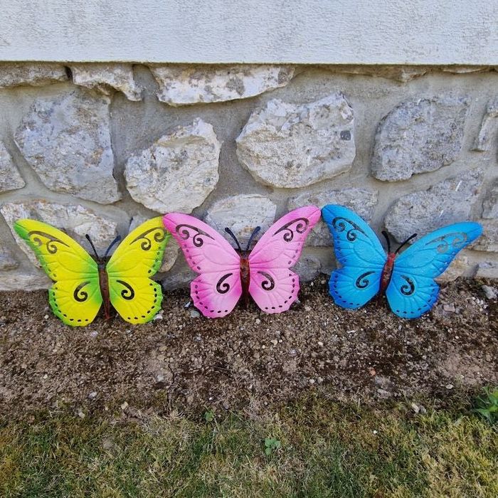 1 lot de 3 décorations murales en forme de papillons avec différentes couleurs en métal 1 fixation neuves ( jamais utilisées ) les mesures : hauteur : environ 30 cm longueur : environ 41 cm
