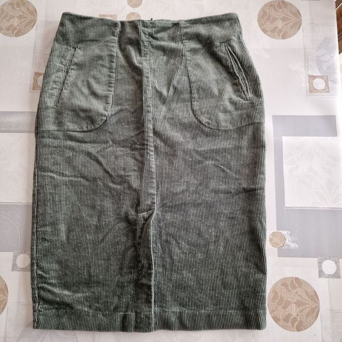jupe longue kaki en velours marque KIABI taille 46 s'attache derrière avec une fermeture éclair 2 fausses poches devant fendue devant 99 % coton 1 % élasthanne en très bon état les mesures : hauteur environ : 69 cm tour de taille environ 43 cm x 2