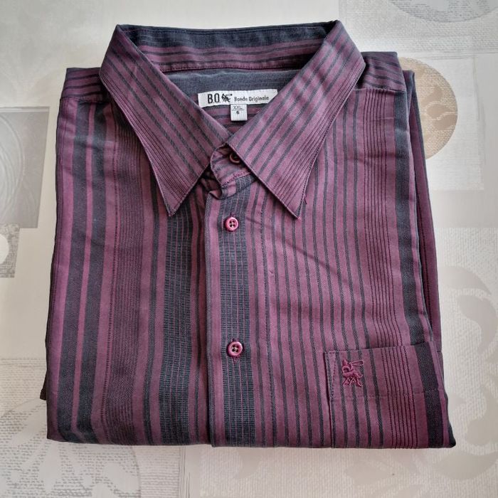 très belle chemise fantaisie pour homme couleurs mauve et noire manches longues taille 6 ( XXL) une poche devant en très bon état marque BO BANDE ORIGINALE 67 %modal 33 % polyester les mesures : aisselles à aisselles environ 68 cm longueur environ 83 cm