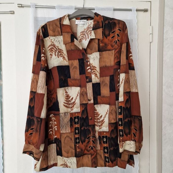 très beau chemisier fantaisie pour femme avec motifs fleurs couleurs marrons, beiges et marrons marque Guy Dubouis taille 52 ou 54 ? ( il n'y a plus d'étiquette ) fendu en bas de chaque côté en très bon état les mesures : aisselles à aisselles environ 64 cm longueur environ 74 cm