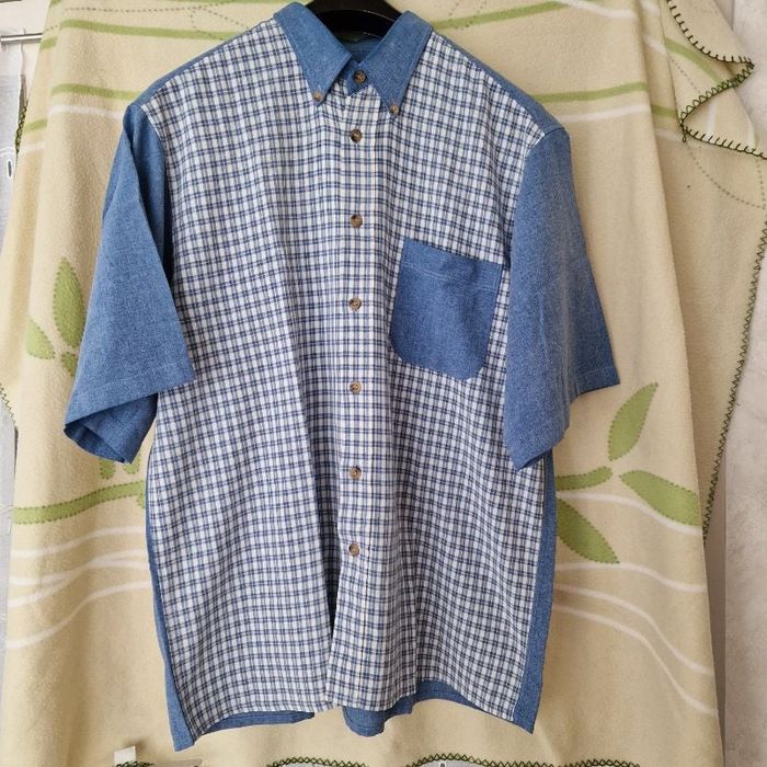 chemise homme fantaisie couleurs carreaux bleus et manches couleur unie jeans et derrière couleur unie jeans manches courtes taille 5 une poche devant en bon état marque ALRO chemises les mesures : aisselles à aisselles environ 64 cm longueur environ 78 cm