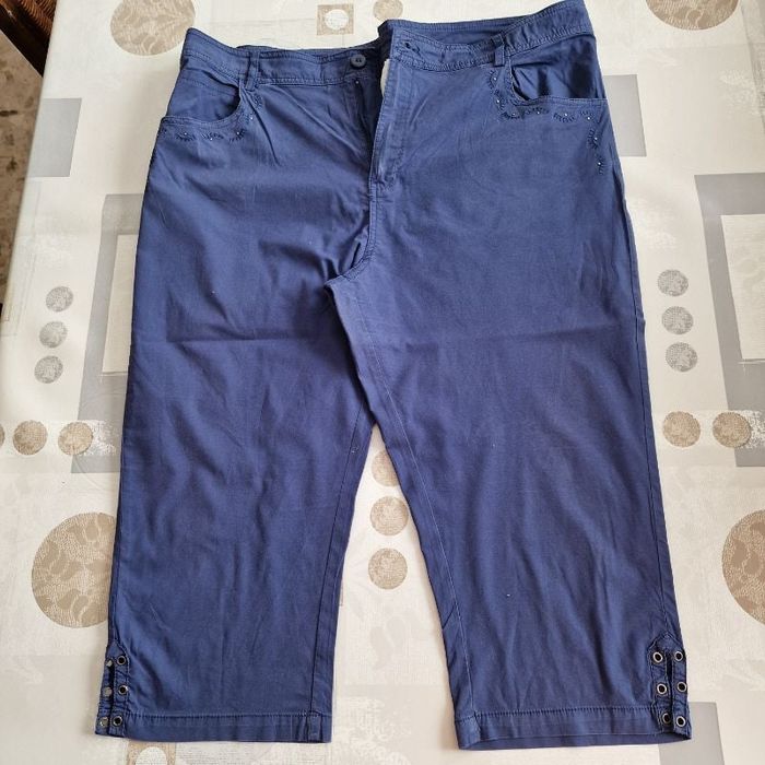pantacourt femme fantaisie couleur bleue marine taille 46 en bon état longueur environ 76 cm 4 poches fantaisies fantaisies en bas des jambes léger 97 % coton 3 % elasthanne