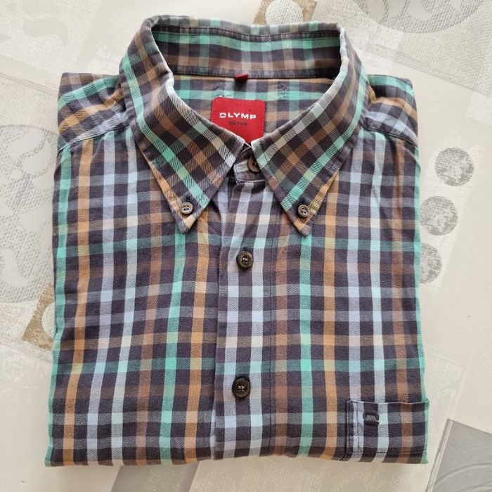 chemise homme à carreaux marron/vert manches longues avec boutons taille XL marque : OLYMP NOVUM 1 poche devant hauteur environ 79 cm en très bon état
