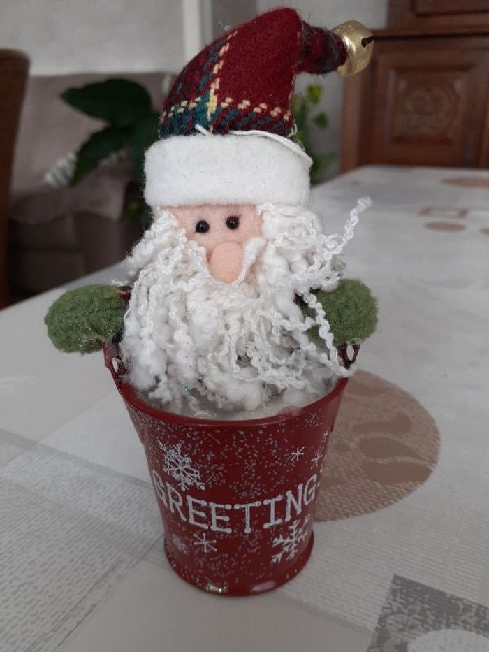 très belle et originale décoration de noël à poser ou à suspendre en très bon état un père noël dans un sceau le père Noël est en tissus le sceau est en métal hauteur environ 17.5 cm