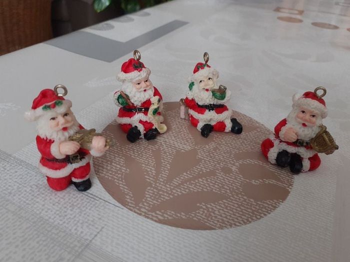 4 petits pères noël musiciens à accrocher ou poser en très bon état hauteur 4 cm
