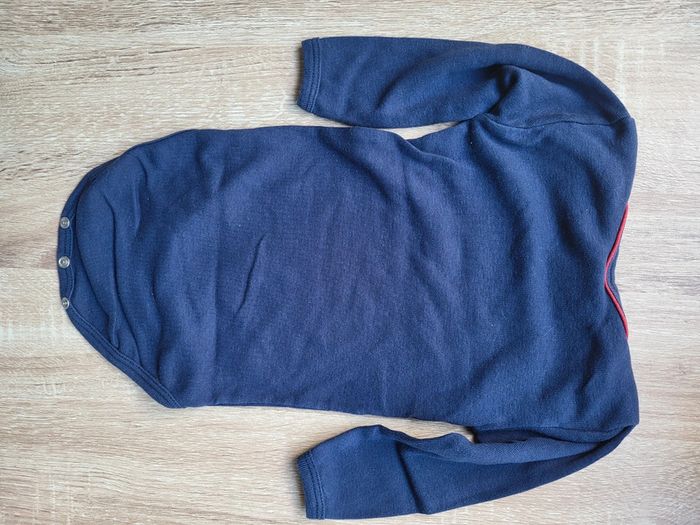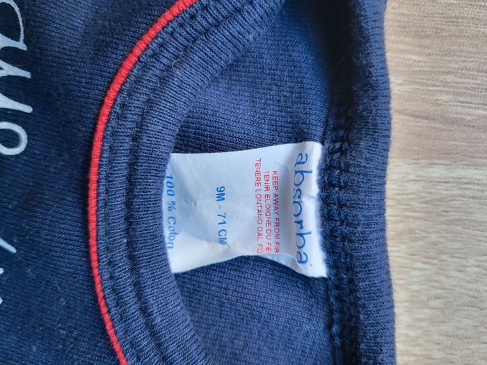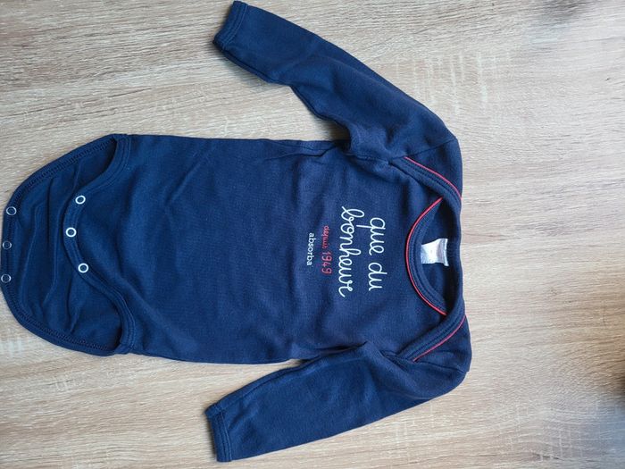 Vends bodie manches longues bleu foncé avec petite phrase ecrit en blanc et rouge, taille 9 mois, de la marque " Absorba" en très très bon état.