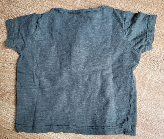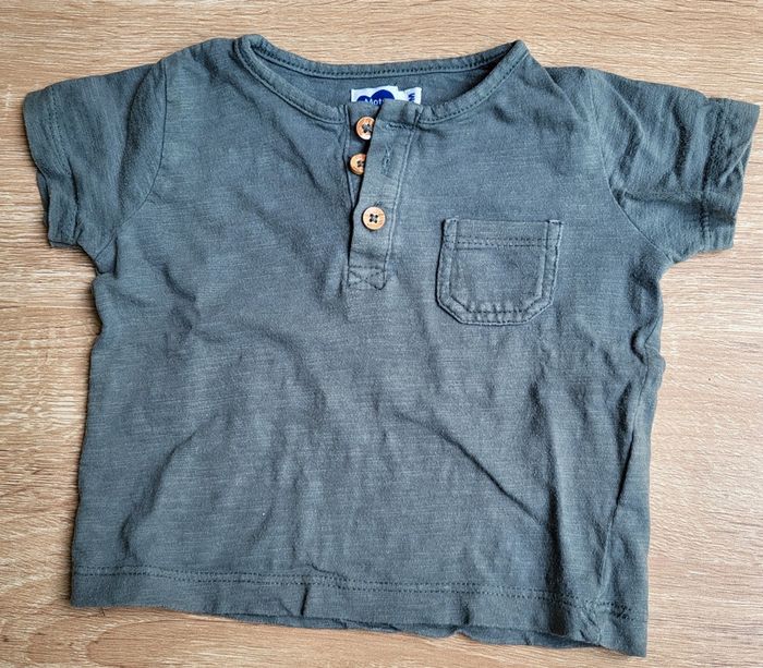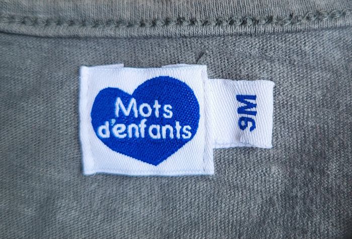 Vends tee-shirt manches courtes de couleur kaki ; taille 9 mois, de la marque "mots d'enfants" en bon état.
