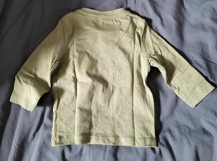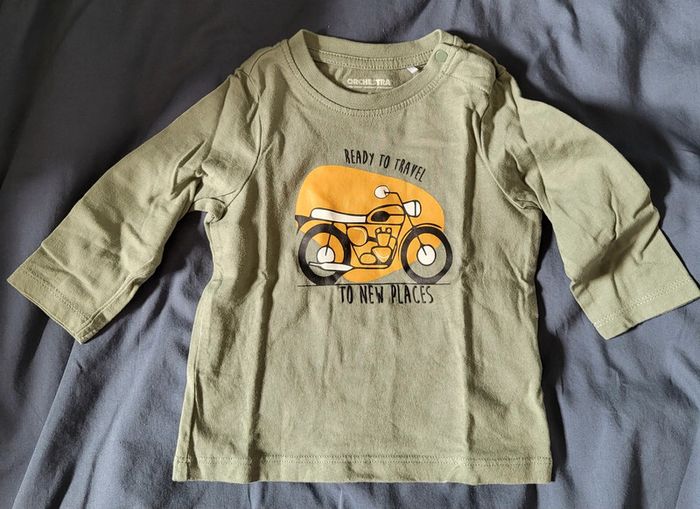 Vends tee-shirt manches longue kaki avec une moto, taille 6 mois, marque Orchestra, en bon très très état, porté une seule fois. Il s'attache avec 2 pressions sur l'épaule.