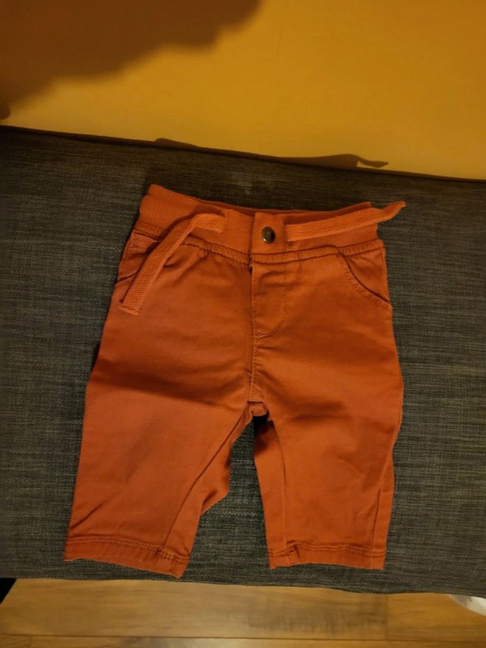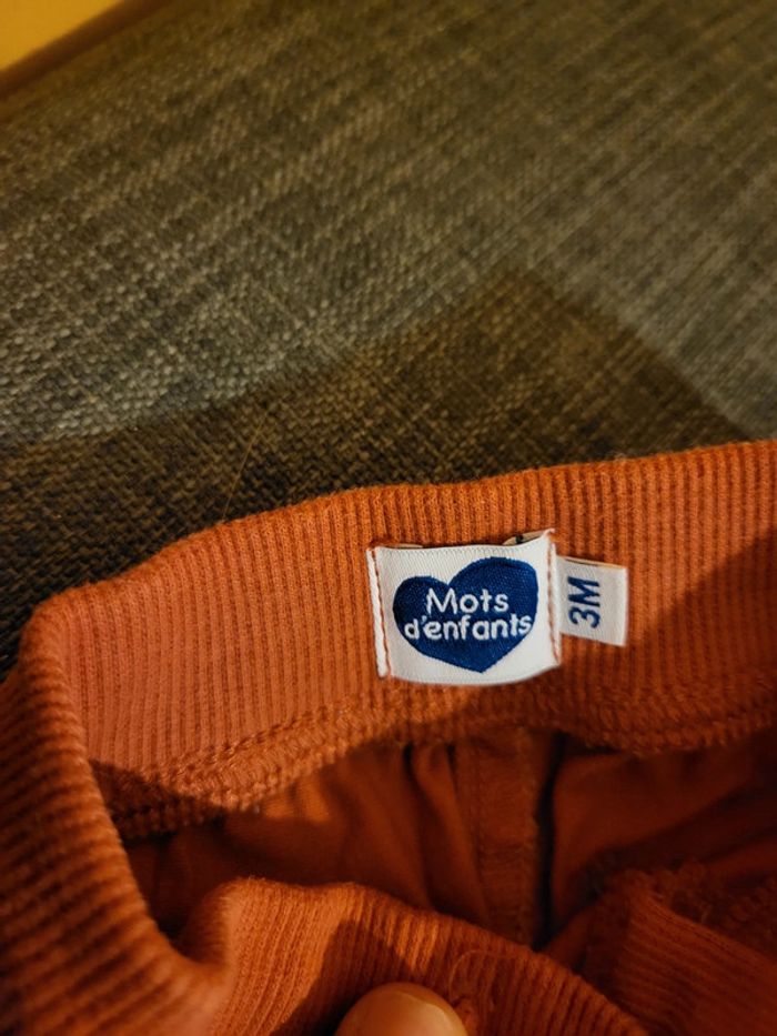 Vends pantalon marron orangé, taille 3 mois, marque Mots d'enfant, en très très bon état, porté une seule fois.
