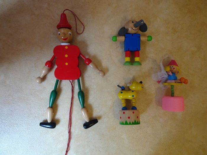 Lot de 4 jeux en bois: un éléphant articulé, une princesse et un chien qui se tortillent quand on appuis sur leur bouton sous le socle et un grand pantin pinocchio qui bouge ses membres quand on tire sur la ficelle. Jouets en bon état.