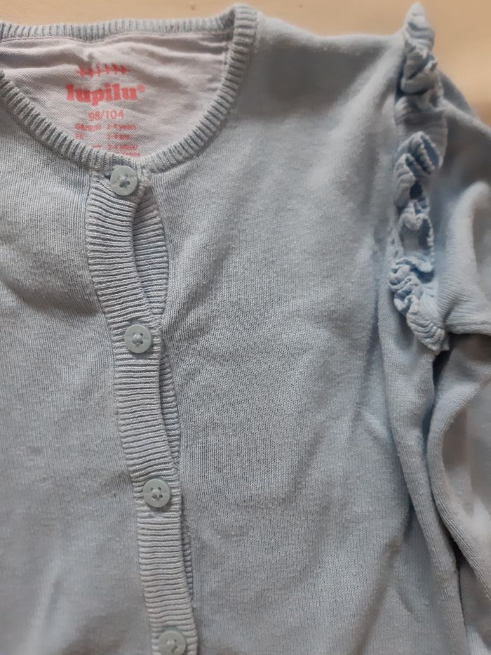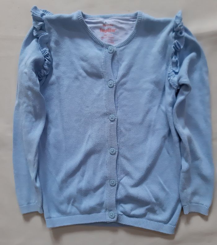 gilet en coton bleu clair, de la marque lupilu, en taille 3 ans mi-saison, été volants sur les épaules En très bon état. 🔍 D'autres vêtements en taille 3 ans disponibles. Utilisez les filtres par tailles pour faciliter vos recherches.