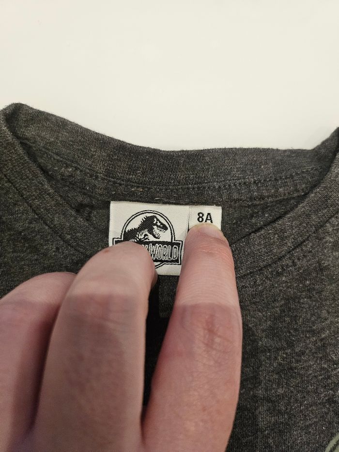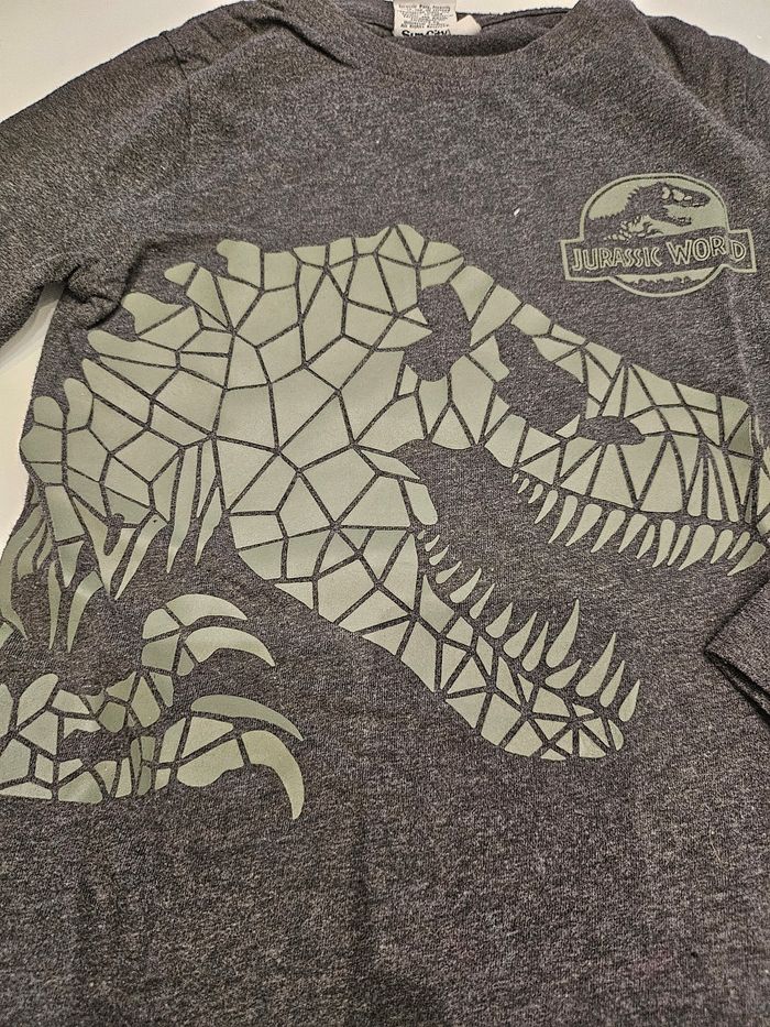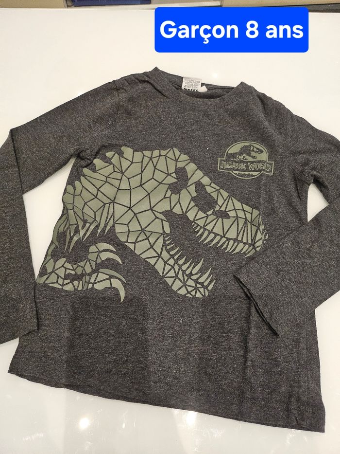 Haut 8 ansT-shirt manches longues gris avec flocage vert dinosaure. Marque : Jurassic Word Taille : 8 ans
