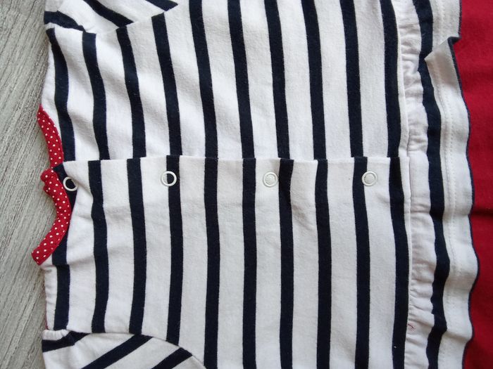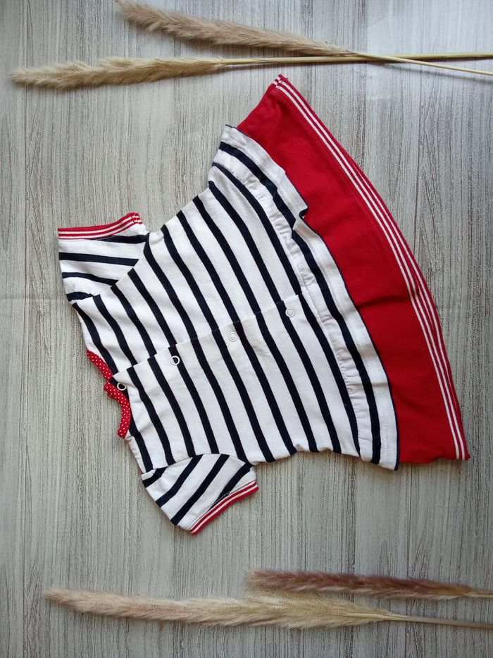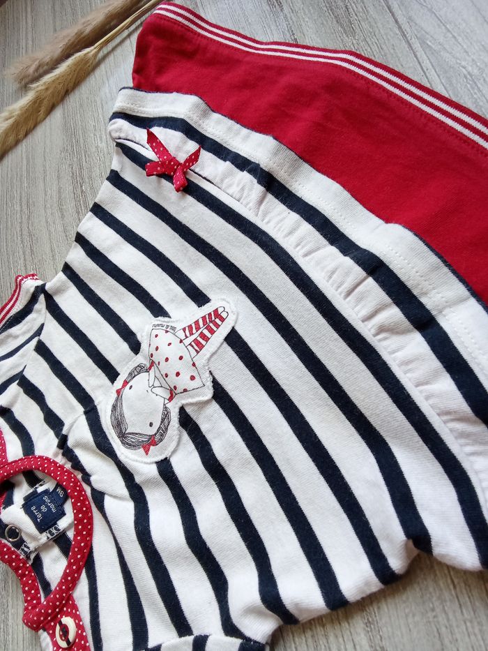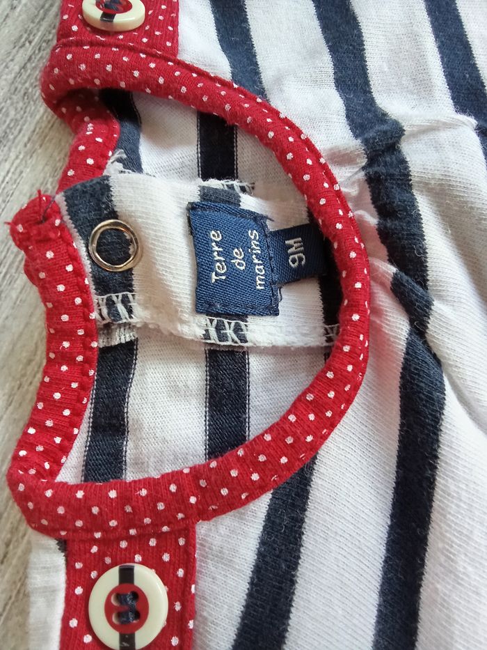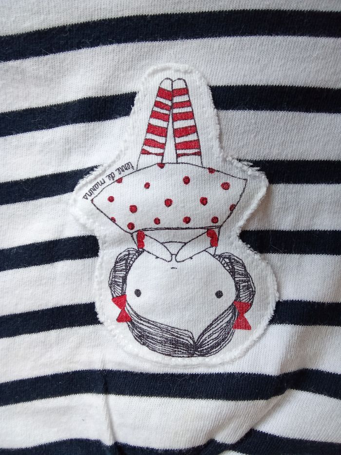Tunique t-shirt Terre de Marin, taille 9 mois, avec une petite fille au centre, style marinière avec présence de rouge aux extrémités de la pièce (col, bas, manches), Référence : 007