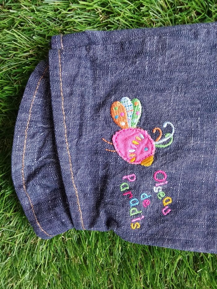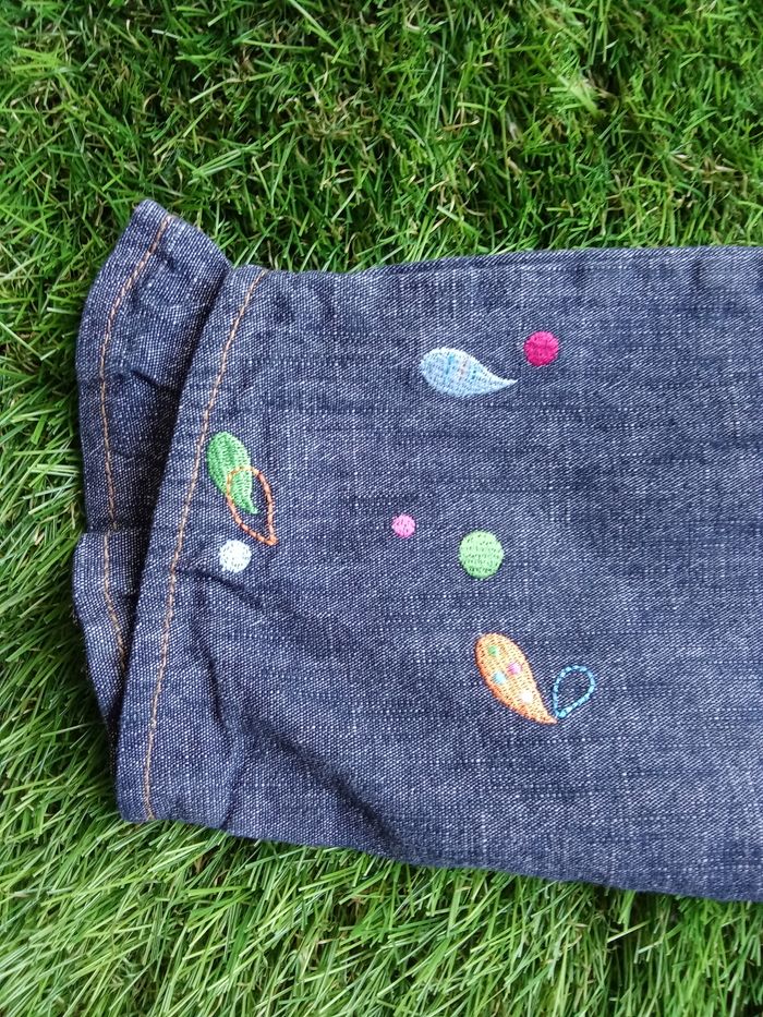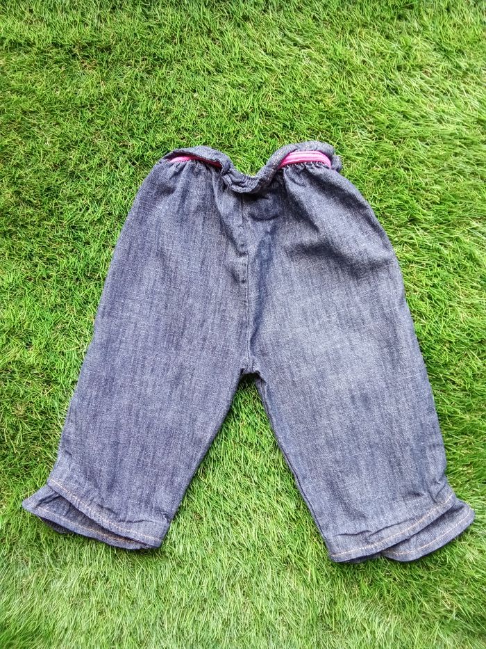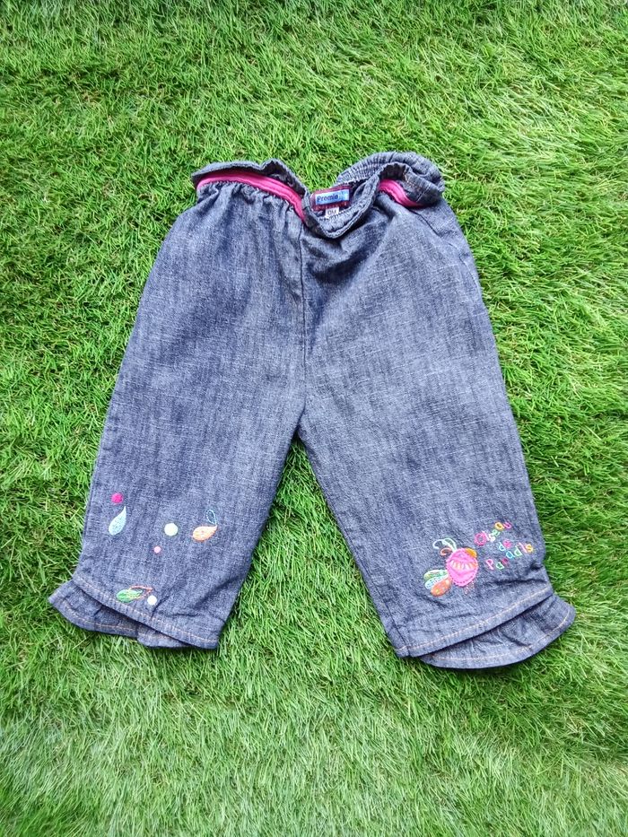 Pantalon bleu Premier Rôle, avec "oiseau du paradis sur jambe gauche et petits motifs sur bas des jambes, taille 9 mois