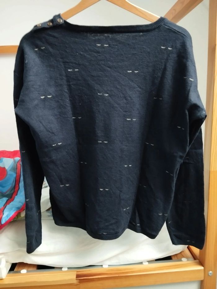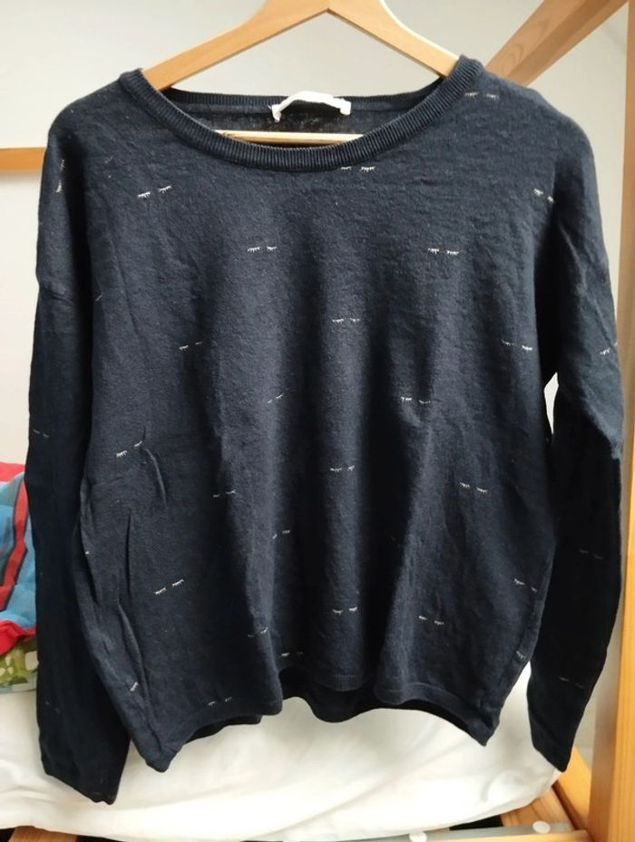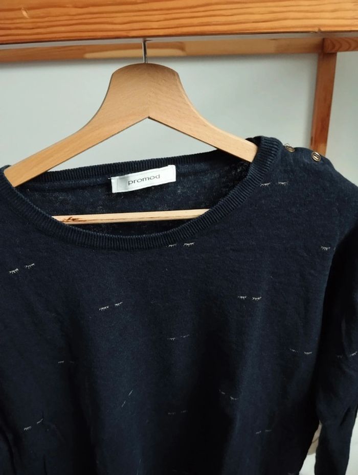 Pull léger Marque Promod Couleur bleu marine avec motif cils doré Bon état pas de défaut Pour filtrer sur les vêtements femme taille 40 -> #leeloo3582_femmeL